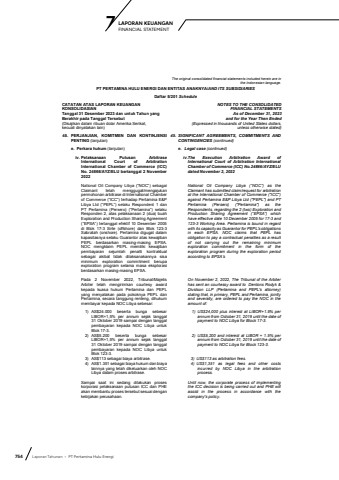 754 Laporan Tahunan %u2022 PT Pertamina Hulu EnergiLAPORAN KEUANGAN 7 FINANCIAL STATEMENTThe original consolidated financial statements included herein are in the Indonesian language.PT PERTAMINA HULU ENERGI DAN ENTITAS ANAKNYA/AND ITS SUBSIDIARIESDaftar 5/201 ScheduleCATATAN ATAS LAPORAN KEUANGANKONSOLIDASIANTanggal 31 Desember 2023 dan untuk Tahun yang Berakhir pada Tanggal Tersebut(Disajikan dalam ribuan dolar Amerika Serikat, kecuali dinyatakan lain)NOTES TO THE CONSOLIDATEDFINANCIAL STATEMENTS As of December 31, 2023and for the Year Then Ended(Expressed in thousands of United States dollars,unless otherwise stated)45. PERJANJIAN, KOMITMEN DAN KONTINJENSIPENTING (lanjutan)45. SIGNIFICANT AGREEMENTS, COMMITMENTS ANDCONTINGENCIES (continued)e. Perkara hukum (lanjutan) e. Legal case (continued)iv. Pelaksanaan Putusan Arbitrase International Court of Arbitration International Chamber of Commerce (ICC) No. 24866/AYZ/ELU bertanggal 2 November 2022iv.The Execution Arbitration Award ofInternational Court of Arbitration InternationalChamber of Commerce (ICC) No.24866/AYZ/ELU dated November 2, 2022National Oil Company Libya (%u201cNOC%u201d) sebagai Claimant telah menggugat/mengajukan permohonan arbitrase di International Chamber of Commerce (%u201cICC%u201d) terhadap Pertamina E&P Libya Ltd (%u201cPEPL%u201d) selaku Respondent 1 dan PT Pertamina (Persero) (%u201cPertamina%u201d) selaku Responden 2, atas pelaksanaan 2 (dua) buah Exploration and Production Sharing Agreement (%u201cEPSA%u201d) tertanggal efektif 10 Desember 2005 di Blok 17-3 Sirte (offshore) dan Blok 123-3 Sabratah (onshore). Pertamina digugat dalam kapasitasnya selaku Guarantor atas kewajiban PEPL berdasarkan masing-masing EPSA. NOC mengklaim PEPL memiliki kewajiban pembayaran sejumlah penalti kontraktual sebagai akibat tidak dilaksanakannya sisa minimum exploration commitment berupa exploration program selama masa eksplorasi berdasarkan masing-masing EPSA.National Oil Company Libya (%u201cNOC%u201d) as the Claimant has submitted claim/request for arbitration at the International Chamber of Commerce (\against Pertamina E&P Libya Ltd (\Pertamina (Persero) (\as the Respondents, regarding the 2 (two) Exploration and Production Sharing Agreement (%u201cEPSA%u201d) which have effective date 10 December 2005 for 17-3 and 123-3 Working Area. Pertamina is bound in regardwith its capacity as Guarantor for PEPL's obligations in each EPSA. NOC claims that PEPL hasobligation to pay a contractual penalties as a result of not carrying out the remaining minimumexploration commitment in the form of theexploration program during the exploration periodaccording to EPSA%u2019sPada 2 November 2022, Tribunal/Majelis Arbiter telah mengirimkan courtesy award kepada kuasa hukum Pertamina dan PEPL yang menyatakan pada pokoknya PEPL dan Pertamina, secara tanggung renteng, dihukum membayar kepada NOC Libya sebesar:1) AS$24.000 beserta bunga sebesarLIBOR+1,5% per annum sejak tanggal31 Oktober 2019 sampai dengan tanggalpembayaran kepada NOC Libya untukBlok 17-3.2) AS$5.200 beserta bunga sebesarLIBOR+1,5% per annum sejak tanggal31 Oktober 2019 sampai dengan tanggal pembayaran kepada NOC Libya untukBlok 123-3.On November 2, 2022, The Tribunal of the Arbiter has sent an courtessy award to Dentons Rodyk & Dividson LLP (Pertamina and PEPL's attorney) stating that, in primary, PEPL and Pertamina, jointly and severally, are ordered to pay the NOC in the amount of:1) US$24,000 plus interest at LIBOR+1.5% perannum from October 31, 2019 until the date of payment to NOC Libya for Block 17-3.2) US$5,200 and interest at LIBOR + 1.5% perannum from October 31, 2019 until the date of payment to NOC Libya for Block 123-3.3) AS$113 sebagai biaya arbitrase.4) AS$1.351 sebagai biaya hukum dan biaya lainnya yang telah dikeluarkan oleh NOCLibya dalam proses arbitrase.Sampai saat ini sedang dilakukan proses korporasi pelaksanaan putusan ICC dan PHE akan membantu proses tersebut sesuai dengan kebijakan perusahaan.3) US$113 as arbitration fees.4) US$1,351 as legal fees and other costsincurred by NOC Libya in the arbitrationprocess.Until now, the corporate process of implementing the ICC decision is being carried out and PHE will assist in the process in accordance with the company's policy.