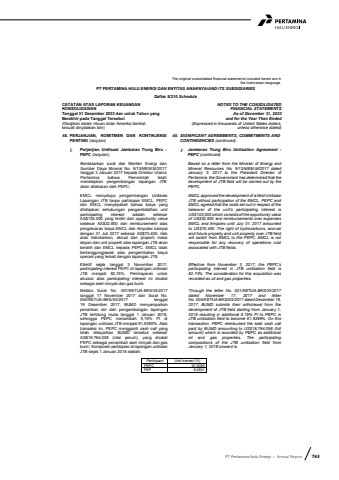 PT Pertamina Hulu Energi %u2022 Annual Report 763The original consolidated financial statements included herein are in the Indonesian language.PT PERTAMINA HULU ENERGI DAN ENTITAS ANAKNYA/AND ITS SUBSIDIARIESDaftar 5/210 ScheduleCATATAN ATAS LAPORAN KEUANGANKONSOLIDASIANTanggal 31 Desember 2023 dan untuk Tahun yang Berakhir pada Tanggal Tersebut(Disajikan dalam ribuan dolar Amerika Serikat,kecuali dinyatakan lain)NOTES TO THE CONSOLIDATEDFINANCIAL STATEMENTSAs of December 31, 2023and for the Year Then Ended(Expressed in thousands of United States dollars,unless otherwise stated)45. PERJANJIAN, KOMITMEN DAN KONTINJENSI PENTING (lanjutan)45. SIGNIFICANT AGREEMENTS, COMMITMENTS AND CONTINGENCIES (continued)j. Perjanjian Unitisasi Jambaran Tiung Biru -PEPC (lanjutan)j. Jambaran Tiung Biru Unitization Agreement -PEPC (continued) Berdasarkan surat dari Menteri Energi dan Sumber Daya Mineral No. 9/13/MEM.M/2017 tanggal 3 Januari 2017 kepada Direktur Utama Pertamina bahwa Pemerintah telah menetapkan pengembangan lapangan JTB akan dilakukan oleh PEPC.Based on a letter from the Minister of Energy and Mineral Resources No. 9/13/MEM.M/2017 dated January 3, 2017 to the President Director of Pertamina, the Government has determined that the development of JTB field will be carried out by the PEPC.EMCL menyetujui pengembangan Unitisasi Lapangan JTB tanpa partisipasi EMCL. PEPC dan EMCL menyepakati bahwa biaya yang ditetapkan sehubungan pengambilalihan unit participating interest adalah sebesar AS$103.000 yang terdiri dari opportunity valuesebesar AS$32.600 dan reimbursement atas pengeluaran biaya EMCL dan Ampolex sampai dengan 31 Juli 2017 sebesar AS$70.400. Hak atas hidrokarbon, akrual dan properti masa depan dan unit properti atas lapangan JTB akan beralih dari EMCL kepada PEPC. EMCL tidak bertanggungjawab atas pengembalian biaya operasi yang terkait dengan lapangan JTB.EMCL approved the development of a field Unitisasi JTB without participation of the EMCL. PEPC and EMCL agreed that the costs set out in respect of the takeover of the unit's participating interest is US$103,000 which consists of the opportunity value of US$32,600 and reimbursements over expenses EMCL and Ampolex until July 31, 2017 amounted to US$70,400. The right of hydrocarbons, accrual and future property and unit property over JTB field will switch from EMCL to the PEPC. EMCL is not responsible for any recovery of operations cost associated with JTB fields.Efektif sejak tanggal 3 November 2017, participating interest PEPC di lapangan unitisasi JTB menjadi 82,74%. Pembayaran untuk akuisisi atas participating interest ini dicatat sebagai aset minyak dan gas bumi.Effective from November 3, 2017, the PEPC%u2019s participating interest in JTB unitization field is 82.74%. The consideration for this acquisition was recorded as oil and gas properties.Melalui Surat No. 001/KETUA-BKS/XI/2017 tanggal 17 November 2017 dan Surat No.004/KETUA-BKS/XII/2017 tanggal 19 Desember 2017, BUMD menyampaikan penarikan diri dari pengembangan lapangan JTB terhitung mulai tanggal 1 Januari 2018, sehingga PEPC menambah 9,19% PI di lapangan unitisasi JTB menjadi 91,9399%. Atas transaksi ini, PEPC mengganti cash call yang telah dibayarkan BUMD tersebut sebesar AS$16.764.058 (nilai penuh), yang dicatat PEPC sebagai penambah aset minyak dan gas bumi. Komposisi partisipasi di lapangan unitisasi JTB sejak 1 Januari 2018 adalah:Through the letter No. 001/KETUA-BKS/XI/2017 dated November 17, 2017 and letterNo. 004/KETUA-BKS/XII/2017 dated December 19, 2017, BUMD submits their withdrawal from the development of JTB field starting from January 1, 2018 resulting in additional 9.19% PI to PEPC in JTB unitization field to become 91.9399%. On this transaction, PEPC reimbursed the total cash call paid by BUMD amounting to US$16,764,058 (full amount) which is recorded by PEPC as additional oil and gas properties. The participating compositions of the JTB unitization field from January 1, 2018 onward is:Participant Unit interest (%)PEPC 91,9399PEP 8,0601