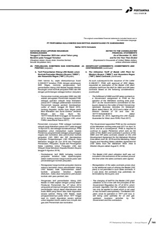 PT Pertamina Hulu Energi %u2022 Annual Report 765The original consolidated financial statements included herein are in the Indonesian language.PT PERTAMINA HULU ENERGI DAN ENTITAS ANAKNYA/AND ITS SUBSIDIARIESDaftar 5/212 ScheduleCATATAN ATAS LAPORAN KEUANGANKONSOLIDASIANTanggal 31 Desember 2023 dan untuk Tahun yang Berakhir pada Tanggal Tersebut(Disajikan dalam ribuan dolar Amerika Serikat,kecuali dinyatakan lain)NOTES TO THE CONSOLIDATEDFINANCIAL STATEMENTSAs of December 31, 2023and for the Year Then Ended(Expressed in thousands of United States dollars,unless otherwise stated)45. PERJANJIAN, KOMITMEN DAN KONTINJENSI PENTING (lanjutan)45. SIGNIFICANT AGREEMENTS, COMMITMENTS AND CONTINGENCIES (continued)k. Tarif Pemanfaatan Kilang LNG Badak untuk Kontrak Penjualan Western Buyers (%u201cWBX%u201d) dan Nusantara Regas (%u201cNR%u201d) (lanjutan)k. The Utilization Tariff of Badak LNG Plant for Western Buyers (%u201cWBX%u201d) and Nusantara Regas (%u201cNR%u201d) Sales Contracts (continued)Oleh karena itu, sejak dikeluarkannya Surat S-355/2017 tersebut, PHM, dengan persetujuan SKK Migas, meminta pengecualian tarif pemanfaatan kilang LNG Badak kepada Menteri Keuangan untuk kontrak penjualan WBX dan NR dengan pertimbangan sebagai berikut: (lanjutan)As such, subsequent to the issuance of the Letter S-355/2017, PHM, with approval of SKK Migas, requested an exemption of the Badak LNG plant utilization tariff from the MoF for WBX and NR sales contracts based on the following considerations: (continued)- Pemenuhan kontrak penjualan WBX dan NR adalah penugasan Pemerintah kepada PHM sebagai operator wilayah kerja Mahakam pasca-2017 sebagai pelaksanaan komitmen Pemerintah kepada pembeli (berdasarkan Letter of Intent, tanggal 26 Maret 2010, tentang Kegiatan Usaha Hulu Migas pada Blok Mahakam dan Surat Direktur Jenderal Minyak dan Gas Bumi No. 16777/15/DJM.B/2012 tanggal 22 November 2012, tentang Jaminan Pasokan LNG untuk FSRU Jawa Barat Pasca-2017). - The fulfillment of WBX and NR sales contracts is a Government assignment to PHM as the operator of the Mahakam working area post2017 as the Government%u2019s commitment to the buyers (based on the Letter of Intent Concerning Upstream Business Activities On Mahakam Block dated March 26, 2010 and a letter of the Director General of Oil and Gas No. 16777/15/DJM.B/2012 dated November 22, 2012, regarding the LNG Supply Guarantee for West Java FSRU Post-2017). Pemerintah menunjuk PHM sebagai kontraktor wilayah kerja Mahakam pasca-2017 pada tanggal 14 April 2015, dan sebagai konsekuensinya, PHM diwajibkan untuk melanjutkan suplai kepada Pertamina yang bertindak sebagai penjual bagian negara dan kontraktor atas pemenuhan kontrak penjualan LNG WBX dan NR (berdasarkan Perjanjian Pengembangan LNG Wilayah Kerja Mahakam tanggal 26 Juni 2018 dan Perjanjian Pemasaran, Penjualan, Suplai dan Penanganan Sales Liabilities Untuk Penjualan LNG dari Wilayah Kerja Mahakam Kepada Western Buyers tanggal 9 Agustus 2018);The Government appointed PHM as the contractor of the Mahakam working area post-2017 on April 14, 2015, and as a consequence, PHM is required to continue to supply Pertamina which acts as the seller of the State%u2019s and contractor%u2019s portions of the WBX and NR sales contracts (based on the LNG Development Agreement for the Mahakam Working Area dated June 26, 2018 and the Marketing, Sales, Supply and Handling Sales Liabilities Agreement for LNG Sales from the Mahakam Work Area to Western Buyers dated August 9, 2018);- Pembebanan tarif BMN terhadap kontrak penjualan tersebut tidak diperhitungkan dalam keekonomian harga kontrak pada saat penandatangan kontrak penjualan;- The Badak LNG plant utilization tariff was not included in the economics of the contract price at the time when the sales contracts were signed;- Renegosiasi harga kontrak penjualan (karena adanya tambahan biaya pemanfaatan kilang LNG Badak) tidak diperbolehkan dalam kontrak penjualan tersebut. Apabila dilakukan, maka akan berpotensi pemutusan kontrak oleh para pembeli; dan- Renegotiation of the sales contracts prices (due to the additional costs of utilizing the Badak LNG plant) is not permitted in such sales contracts. If it was done, the contracts may potentially be terminated by the buyers; and- Pengenaan tarif pemanfaatan kilang LNG Badak ini tidak sejalan dengan prinsip dalam Peraturan Pemerintah No. 27 tahun 2014 yang pada prinsipnya mengatur bahwa skema pemanfaatan hanya dapat diberlakukan atas suatu BMN yang belum atau tidak digunakan secara optimal. Kilang LNG Badak, sejak pengoperasiannya pada tahun 1977 hingga saat ini, masih digunakan secara optimal untuk kegiatan bisnis usaha hulu minyak dan gas oleh Pemerintah dan kontraktor. - The charging of tariff for the Badak LNG plant utilization is not in-line with the principles of the Government Regulation No. 27 of 2014, which principle regulates that the utilization scheme can only be applied to asset which is not used or has not been used optimally. The Badak LNG plant, since its operation in 1977 until now, is still being used optimally for oil and gas upstream business activities by the Government and the contractors.