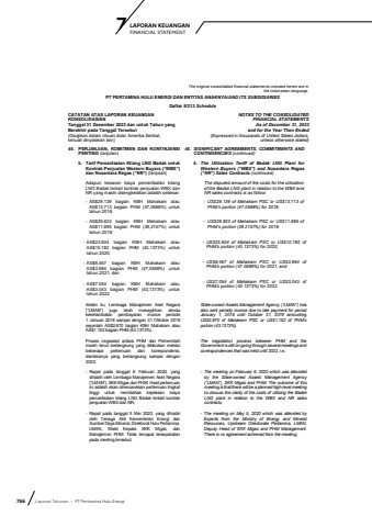 766 Laporan Tahunan %u2022 PT Pertamina Hulu EnergiLAPORAN KEUANGAN 7 FINANCIAL STATEMENTThe original consolidated financial statements included herein are in the Indonesian language.PT PERTAMINA HULU ENERGI DAN ENTITAS ANAKNYA/AND ITS SUBSIDIARIESDaftar 5/213 ScheduleCATATAN ATAS LAPORAN KEUANGANKONSOLIDASIANTanggal 31 Desember 2023 dan untuk Tahun yang Berakhir pada Tanggal Tersebut(Disajikan dalam ribuan dolar Amerika Serikat,kecuali dinyatakan lain)NOTES TO THE CONSOLIDATEDFINANCIAL STATEMENTSAs of December 31, 2023and for the Year Then Ended(Expressed in thousands of United States dollars,unless otherwise stated)45. PERJANJIAN, KOMITMEN DAN KONTINJENSI PENTING (lanjutan)45. SIGNIFICANT AGREEMENTS, COMMITMENTS AND CONTINGENCIES (continued)k. Tarif Pemanfaatan Kilang LNG Badak untuk Kontrak Penjualan Western Buyers (%u201cWBX%u201d) dan Nusantara Regas (%u201cNR%u201d) (lanjutan)k. The Utilization Tariff of Badak LNG Plant for Western Buyers (%u201cWBX%u201d) and Nusantara Regas (%u201cNR%u201d) Sales Contracts (continued)Adapun besaran biaya pemanfaatan kilang LNG Badak terkait kontrak penjualan WBX dan NR yang masih disengketakan adalah sebesar: The disputed amount of the costs for the utilization of the Badak LNG plant in relation to the WBX and NR sales contracts is as follo- AS$29.139 bagian KBH Mahakam atau AS$13.713 bagian PHM (47,0588%) untuk tahun 2018;- US$29,139 of Mahakam PSC or US$13,713 of PHM%u2019s portion (47.0588%) for 2018%u037e- AS$29.823 bagian KBH Mahakam atau AS$11.695 bagian PHM (39,2157%) untuk tahun 2019;- US$29,823 of Mahakam PSC or US$11,695 of PHM%u2019s portion (39.2157%) for 2019;- AS$23.604 bagian KBH Mahakam atau AS$10.182 bagian PHM (43,1373%) untuk tahun 2020;- AS$8.467 bagian KBH Mahakam atau AS$3.984 bagian PHM (47,0588%) untuk tahun 2021; dan- AS$7.054 bagian KBH Mahakam atau AS$3.043 bagian PHM (43,1373%) untuk tahun 2022.- US$23,604 of Mahakam PSC or US$10,182 of PHM%u2019s portion (43.1373%) for 2020%u037e- US$8,467 of Mahakam PSC or US$3,984 of PHM%u2019s portion (47.0588%) for 2021%u037e and- US$7,054 of Mahakam PSC or US$3,043 of PHM%u2019s portion (43.1373%) for 2022.Selain itu, Lembaga Manajemen Aset Negara (%u201cLMAN%u201d) juga telah menagihkan denda keterlambatan pembayaran invoice periode 1 Januari 2018 sampai dengan 31 Oktober 2019 sejumlah AS$2.670 bagian KBH Mahakam atau AS$1.152 bagian PHM (43,1373%).State-owned Assets Management Agency (%u201cLMAN%u201d) has also sent penalty invoice due to late payment for period January 1, 2018 until October 31, 2019 amounting US$2,670 of Mahakam PSC or US$1,152 of PHM%u2019s portion (43.1373%).Proses negosiasi antara PHM dan Pemerintah masih terus berlangsung yang dilakukan melalui beberapa pertemuan dan korespondensi, diantaranya yang berlangsung sampai dengan 2022:The negotiation process between PHM and the Government is still on going through several meetings and correspondences that was held until 2022, i.e.:- Rapat pada tanggal 6 Februari 2020, yang dihadiri oleh Lembaga Manajemen Aset Negara (%u201cLMAN%u201d), SKK Migas dan PHM. Hasil pertemuan ini adalah akan direncanakan pertemuan tingkat tinggi untuk membahas kejelasan biaya pemanfaatan kilang LNG Badak terkait kontrak penjualan WBX dan NR;- The meeting on February 6, 2020 which was attended by the State-owned Assets Management Agency (%u201cLMAN%u201d), SKK Migas and PHM. The outcome of this meeting is that there will be a planned high-level meeting to discuss the clarity of the costs of utilizing the Badak LNG plant in relation to the WBX and NR sales contracts;- Rapat pada tanggal 5 Mei 2020, yang dihadiri oleh Tenaga Ahli Kementerian Energi dan Sumber Daya Mineral, Direktorat Hulu Pertamina, LMAN, Wakil Kepala SKK Migas, dan Manajemen PHM. Tidak tercapai kesepakatan pada meeting tersebut;- The meeting on May 5, 2020 which was attended by Experts from the Ministry of Energy and Mineral Resources, Upstream Directorate Pertamina, LMAN, Deputy Head of SKK Migas and PHM Management. There is no agreement achieved from the meeting;