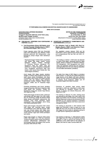 PT Pertamina Hulu Energi %u2022 Annual Report 767The original consolidated financial statements included herein are in the Indonesian language.PT PERTAMINA HULU ENERGI DAN ENTITAS ANAKNYA/AND ITS SUBSIDIARIESDaftar 5/214 ScheduleCATATAN ATAS LAPORAN KEUANGANKONSOLIDASIANTanggal 31 Desember 2023 dan untuk Tahun yang Berakhir pada Tanggal Tersebut(Disajikan dalam ribuan dolar Amerika Serikat,kecuali dinyatakan lain)NOTES TO THE CONSOLIDATEDFINANCIAL STATEMENTSAs of December 31, 2023and for the Year Then Ended(Expressed in thousands of United States dollars,unless otherwise stated)45. PERJANJIAN, KOMITMEN DAN KONTINJENSI PENTING (lanjutan)45. SIGNIFICANT AGREEMENTS, COMMITMENTS AND CONTINGENCIES (continued)k. Tarif Pemanfaatan Kilang LNG Badak untuk Kontrak Penjualan Western Buyers (%u201cWBX%u201d) dan Nusantara Regas (%u201cNR%u201d) (lanjutan)k. The Utilization Tariff of Badak LNG Plant for Western Buyers (%u201cWBX%u201d) and Nusantara Regas (%u201cNR%u201d) Sales Contracts (continued)Proses negosiasi antara PHM dan Pemerintah masih terus berlangsung yang dilakukan melalui beberapa pertemuan dan korespondensi, yang berlangsung sampai dengan 2022 diantaranya: (lanjutan)The negotiation process between PHM and the Government is still on going through several meetings and correspondences that was held until 2022, i.e.: (continued)- Rapat pada tanggal 7 Oktober 2020, yang dihadiri oleh Kepala SKK Migas, Direktur Jendral Kekayaan Negara, Direktur Keuangan PT Pertamina (Persero), Manajemen PHI, Manajemen PHM dan LMAN. Hasil dari pertemuan ini adalah tercapainya kesepakatan untuk mengajukan permohonan legal opini kepada Jaksa Agung Muda Perdata dan Tata Usaha Negara (Jamdatun);- The meeting on October 7, 2020 which was attended by Head of SKK Migas, Directorate General of State Assets, Director of Finance PT Pertamina (Persero), PHI Management, PHM Management and LMAN. There was agreement reached from the meeting to seek legal opinion from the Junior Attorney General for Civil and State Administration (Jamdatun);- Surat Kepala SKK Migas kepada Jamdatun tanggal 14 Oktober 2020 mengenai Permohonan Opini Hukum terkait Pembebanan Tarif Sewa Pemanfaatan Aktiva Kilang LNG Badak terhadap Volume LNG dari Wilayah Kerja Mahakam berdasarkan Kontrak Penjualan Western Buyer Extension (\(\- The letter from Head of SKK Migas to Jamdatun dated October 14, 2020 with the subject Request for Legal Opinion of the Badak LNG plant utilization tariff for the LNG Volume from Mahakam Work Area of Western Buyer Extension (WBX) and PT Nusantara Regas (NR) Sales Contracts;- Workshop pembahasan opini hukum Jamdatun tanggal 5 November 2020 dan 8 Desember 2020 yang dihadiri oleh Jamdatun, Tenaga Ahli Kementerian Energi dan Sumber Daya Mineral, SKK Migas dan PHM;- Workshop of Jamdatun legal opinion dated November 5, 2020 and December 8, 2020 which was attended by Jamdatun, Experts from the Ministry of Energy and Mineral Resources, SKK Migas and PHM;- Rapat pada tanggal 18 Februari 2021, pertemuan yang dihadiri oleh SKK Migas, PHI, PHM, LMAN, dan Tim Pendukung Tenaga Ahli Menteri ESDM terkait dengan pembahasan keekonomian WK Mahakam untuk usulan pemberian insentif pembebasan biaya pemanfaatan aktiva Kilang LNG Badak yang dikelola LMAN;- The meeting on February 18, 2021, meeting which was attended by SKK Migas, PHI, PHM, LMAN, SKK Migas and Experts from the Ministry of Energy and Mineral Resources to discuss the economics of PSC Mahakam for the incentive proposal of exemption from the utilization of Badak LNG Plant%u2019s asset which managed by LMAN; - Rapat pada tanggal 2 November 2021 antara SKK Migas dan PHI/PHM dalam rangka menindaklanjuti issue WBX-NR dengan salah satu way forward adalah SKK Migas akan mengirimkan surat kembali kepada Jamdatun untuk meminta Legal Opini terkait penetapan tarif LMAN;- Rapat pada tanggal 11 Februari 2022 antara LMAN, SKK Migas, PHI, PHM dan Direktorat Jenderal Anggaran dalam rangka pembahasan proposal penyelesaian pembayaran tarif pemanfaatan kilang LNG Badak untuk kontrak penjualan WBX-NR oleh PHM;- The meeting on November 2, 2021 between SKK Migas and PHI/PHM in order to follow up on the WBX-NR issue with one of the way forwards is that SKK Migas will send a letter to Jamdatun asking for a Legal Opinion regarding the LMAN tariff;- The meeting on February 11, 2022 between LMAN, SKK Migas and PHI, PHM and Direktorat Jenderal Anggaran in order to discuss the proposal for the settlement of the LMAN tariff for the utilization of Badak LNG Plant for sales Contract WBX-NR;
