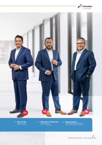 04. 05. 06.04. Harry M. ZenDirektur KeuanganDirector of Finance06. Awang Lazuardi Direktur Pengembangan & ProduksiDirector of Development & Production05. Muharram J. PangurisengDirektur EksplorasiDirector of ExplorationPT Pertamina Hulu Energi %u2022 Annual Report 75