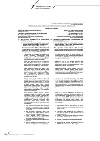768 Laporan Tahunan %u2022 PT Pertamina Hulu EnergiLAPORAN KEUANGAN 7 FINANCIAL STATEMENTThe original consolidated financial statements included herein are in the Indonesian language.PT PERTAMINA HULU ENERGI DAN ENTITAS ANAKNYA/AND ITS SUBSIDIARIESDaftar 5/215 ScheduleCATATAN ATAS LAPORAN KEUANGANKONSOLIDASIANTanggal 31 Desember 2023 dan untuk Tahun yang Berakhir pada Tanggal Tersebut(Disajikan dalam ribuan dolar Amerika Serikat,kecuali dinyatakan lain)NOTES TO THE CONSOLIDATEDFINANCIAL STATEMENTSAs of December 31, 2023and for the Year Then Ended(Expressed in thousands of United States dollars,unless otherwise stated)45. PERJANJIAN, KOMITMEN DAN KONTINJENSI PENTING (lanjutan)45. SIGNIFICANT AGREEMENTS, COMMITMENTS AND CONTINGENCIES (continued)k. Tarif Pemanfaatan Kilang LNG Badak untuk Kontrak Penjualan Western Buyers (%u201cWBX%u201d) dan Nusantara Regas (%u201cNR%u201d) (lanjutan)k. The Utilization Tariff of Badak LNG Plant for Western Buyers (%u201cWBX%u201d) and Nusantara Regas (%u201cNR%u201d) Sales Contracts (continued)Proses negosiasi antara PHM dan Pemerintah masih terus berlangsung yang dilakukan melalui beberapa pertemuan dan korespondensi, diantaranya yang berlangsung sampai dengan 2022: (lanjutan)The negotiation process between PHM and the Government is still on going through several meetings and correspondences that was held until 2022, i.e.: (continued)- Pada tanggal 19 Mei 2022, DJKN atas nama Menteri Keuangan mengeluarkan surat tanggapan atas surat Menteri ESDM tanggal 22 Februari 2022 perihal usulan penyesuaian tarif pemanfaatan aktiva kilang LNG Badak;- On May 19, 2022, DJKN on behalf of Ministry of Finance issued the letter to response MEMR%u2019s letter dated February 22, 2022 regarding of proposal to fee adjstment of utilization;- Rapat pada tanggal 25 Juli 2022 antara PHM dan SKK Migas dalam rangka pembahasan tindak lanjut penyelesaian tarif pemanfaatan aktiva kilang LNG Badak untuk WBX dan NR.- Meeting on July 25, 2022 between PHM and SKK Migas in order to discuss the follow up the settlement of tariffs for the assets utilization of the Badak LNG Plant for WBX and NR.- Rapat tanggal 5 Agustus 2022 antara PHM, SKK Migas, LMAN, Direktorat Jenderal Migas KESDM, dan Direktorat Jenderal Anggaran (DJA) Kemenkeu dalam rangka pembahasan atas penyelesaian kewajiban biaya pemanfaatan kilang LNG Badak untuk kontrak penjualan WBX dan NR.- Meeting on August 5, 2022 between PHM, SKK Migas, LMAN, Direktorat Jenderal Migas MEMR, and Direktorat Jenderal Anggaran (DJA) Ministry of Finance in order to discuss the settlement of Badak LNG plant for WBX and NR sales contracts.- Sebagai tindak lanjut dari Notulen Rapat 5 Agustus 2022, PHM telah menyampaikan surat kepada SKK Migas pada tanggal 10 Agustus 2022 untuk mengusulkan pembayaran secara bertahap hingga tahun 2037 beserta justifikasinya, dengan didasari terlebih dahulu pada suatu perjanjian pembayaran WBX NR. PHM juga berharap agar dengan diselesaikannya issue tersebut, DMO fee PHM dapat segera dibayarkan.- As a follow-up to the Minutes on August 5, 2022, PHM has submitted a letter to SKK Migas on August 10 to propose payment in installment until 2037 along with the consideration, based in advance on a settlement agreement. PHM also hopes that with the completion of the issue, PHM's DMO fee can be paid in due time.- Surat Menteri ESDM kepada Menteri Keuangan tanggal 31 Agustus 2022 yang menyatakan bahwa dengan pertimbangan sebagai bentuk itikad baik dari PHM, dan demi menjaga keuangan PHM untuk tetap dapat melaksanakan komitmen eksploitasi demi pencapaian target lifting nasional, dan keberlangsungan investasi di hulu migas, maka mengusulkan:- Letter of the Minister of ESDM to the Minister of Finance dated August 31, 2022 which states that with consideration of good faith from PHM, and in order to maintain PHM's finances to continue to carry out exploitation commitments for the achievement of national lifting targets, and sustainability of investment in upstream oil and gas, then proposes:i) agar atas tarif pemanfaatan WBX NR dapat dilakukan pembayaran secara bertahap hingga akhir masa kontrak WK Mahakam di tahun 2037.ii) Nilai kewajiban didasarkan pada BTU Loaded NR dan WBX dikalikan dengan tariff pemanfaatan AS$0,22/MMBTU.iii) Tidak terdapat sanksi adminstrasi, termasuk dihapuskannya tagihan denda yang telah diterbitkan sebelumnya.iv) Dituangkan dalam perjanjian pembayaran WBX-NR.v) Meminta kepada Menkeu agar DMO Fee dibayarkan untuk pencapaian target lifting.i) The utilization tariff for WBX NR can be paid in installment until the end of the Mahakam contract period in 2037.ii) The liability value is based on BTU Loaded NR and WBX multiplied by the utilization rate of US$0.22/MMBTU.iii) There are no administrative sanctions, including the abolition of previously issued fines.iv) Included in the WBX-NR setllement agreement.v) Requesting the Minister of Finance to pay the DMO Fee for achieving the lifting target.