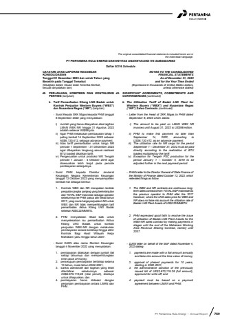 PT Pertamina Hulu Energi %u2022 Annual Report 769The original consolidated financial statements included herein are in the Indonesian language.PT PERTAMINA HULU ENERGI DAN ENTITAS ANAKNYA/AND ITS SUBSIDIARIESDaftar 5/216 ScheduleCATATAN ATAS LAPORAN KEUANGANKONSOLIDASIANTanggal 31 Desember 2023 dan untuk Tahun yang Berakhir pada Tanggal Tersebut(Disajikan dalam ribuan dolar Amerika Serikat,kecuali dinyatakan lain)NOTES TO THE CONSOLIDATEDFINANCIAL STATEMENTSAs of December 31, 2023and for the Year Then Ended(Expressed in thousands of United States dollars,unless otherwise stated)45. PERJANJIAN, KOMITMEN DAN KONTINJENSI PENTING (lanjutan)45. SIGNIFICANT AGREEMENTS, COMMITMENTS AND CONTINGENCIES (continued)k. Tarif Pemanfaatan Kilang LNG Badak untuk Kontrak Penjualan Western Buyers (%u201cWBX%u201d) dan Nusantara Regas (%u201cNR%u201d) (lanjutan)k. The Utilization Tariff of Badak LNG Plant for Western Buyers (%u201cWBX%u201d) and Nusantara Regas (%u201cNR%u201d) Sales Contracts (continued)- Surat Kepala SKK Migas kepada PHM tanggal 8 September 2022 yang menyatakan:- Letter from the Head of SKK Migas to PHM dated September 8, 2022 which states:i) Jumlah yang harus dibayarkan atas tagihan LMAN WBX NR hingga 31 Agustus 2022 adalah sebesar AS$98 juta.ii) Agar PHM melakukan pembayaran tahap 1 paling lambat 14 September 2022 sebesar AS$6,130,412, sebagai advance payment.iii) Atas tariff pemanfaatan untuk kargo NR periode 1 September - 31 Desember 2022 agar dibayarkan langsung sesuai realisasi BTU loaded dikalikan tariff.iv) Pengecualian untuk produksi WK Tengah periode 1 Januari - 4 Oktober 2018 agar disesuaikan lebih lanjut pada periode pembayaran selanjutnya.i) The amount to be paid on LMAN WBX NR invoices until August 31, 2022 is US$98 million.ii) PHM to make first payment no later than September 14, 2022, amounting to US$6,130,412, as an advance payment.iii) The utilization rate for NR cargo for the period September 1 %u2013 December 31, 2022 must be paid directly according to the realization of BTU loaded multiplied by the tariff.iv) Exception for Tengah PSC production for the period January 1 %u2013 October 4, 2018 to be adjusted further in the next payment period.- Surat PHM kepada Direktur Jenderal Keuangan Negara Kementerian Keuangan tanggal 12 Oktober 2022 yang menyampaikan kembali hal sebagai berikut:1. Kontrak WBX dan NR merupakan kontrak penjualan jangka panjang yang berkelanjutan dari TOTAL E&P Indonesie sebagai operator sebelumnya ke PHM pasca alih kelola tahun 2017, yang mana harga penjualan LNG untuk WBX dan NR tidak memperhitungkan tarif pemanfaatan Aktiva Kilang LNG Badak sebesar AS$0,22/MMBTU.2. PHM menyatakan itikad baik untuk menyelesaikan isu pemanfaatan Aktiva Kilang LNG Badak untuk kontrak penjualan WBX-NR dengan melakukan pembayaran secara bertahap hingga akhir Kontrak Bagi Hasil Wilayah Kerja Mahakam yaitu hingga tahun 2037.- Surat DJKN atas nama Menteri Keuangan tanggal 4 November 2022 yang menyatakan:1. pembayaran dilakukan dengan jumlah flatsetiap tahunnya dan memperhitungkan time value of money;2. persetujuan pembayaran bertahap selama 10 tahun, mulai tahun 2022-2031;3. sanksi admistratif dari tagihan yang telah diterbitkan sebelumnya sebesar AS$2.670.119,28 (nilai penuh), disetujui untuk dihapuskan; dan4. pembayaran harus didasari dengan perjanjian pembayaran antara LMAN dan PHM.- PHM's letter to the Director General of State Finance of the Ministry of Finance dated October 12, 2022, which reiterated things as follo1. The WBX and NR contracts are continuous longterm sales contracts from TOTAL E&P Indonesie as the previous operator to PHM after the 2017 handover, where the LNG sales price for WBX and NR does not take into account the utilization rate of Badak LNG Plant Assets of US$0.22/MMBTU.2. PHM expressed good faith to resolve the issue of utilization of Badak LNG Plant Assets for the WBX-NR sales contract by making payments in stages until the end of the Mahakam Working Area Revenue Sharing Contract, namely until 2037.- DJKN letter on behalf of the MoF dated November 4, 2022 stating:1. payments are made with a flat amount annually and take into account the time value of money;2. approval of phased payments for 10 years, starting in 2022-2031;3. the administrative sanction of the previously issued bill of US$2,670,119.28 (full amount), approved for write-off; and4. payment must be based on a payment agreement between LMAN and PHM.