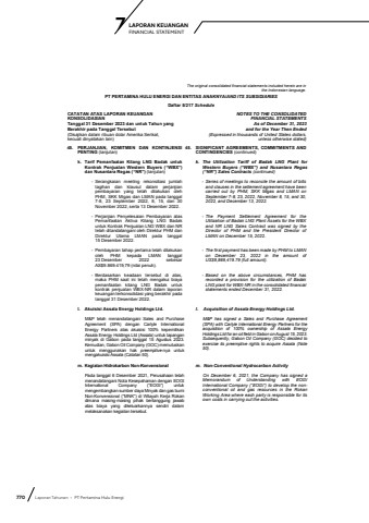 770 Laporan Tahunan %u2022 PT Pertamina Hulu EnergiLAPORAN KEUANGAN 7 FINANCIAL STATEMENTThe original consolidated financial statements included herein are in the Indonesian language.PT PERTAMINA HULU ENERGI DAN ENTITAS ANAKNYA/AND ITS SUBSIDIARIESDaftar 5/217 ScheduleCATATAN ATAS LAPORAN KEUANGANKONSOLIDASIANTanggal 31 Desember 2023 dan untuk Tahun yang Berakhir pada Tanggal Tersebut(Disajikan dalam ribuan dolar Amerika Serikat, kecuali dinyatakan lain)NOTES TO THE CONSOLIDATEDFINANCIAL STATEMENTS As of December 31, 2023and for the Year Then Ended(Expressed in thousands of United States dollars,unless otherwise stated)45. PERJANJIAN, KOMITMEN DAN KONTINJENSI PENTING (lanjutan)45. SIGNIFICANT AGREEMENTS, COMMITMENTS ANDCONTINGENCIES (continued)k. Tarif Pemanfaatan Kilang LNG Badak untukKontrak Penjualan Western Buyers (%u201cWBX%u201d)dan Nusantara Regas (%u201cNR%u201d) (lanjutan)k. The Utilization Tariff of Badak LNG Plant forWestern Buyers (%u201cWBX%u201d) and Nusantara Regas(%u201cNR%u201d) Sales Contracts (continued)- Serangkaian meeting rekonsiliasi jumlahtagihan dan klausul dalam perjanjianpembayaran yang telah dilakukan olehPHM, SKK Migas dan LMAN pada tanggal7-8, 23 September 2022, 8, 15, dan 30November 2022, serta 13 Desember 2022.- Perjanjian Penyelesaian Pembayaran atasPemanfaatan Aktiva Kilang LNG Badakuntuk Kontrak Penjualan LNG WBX dan NRtelah ditandatangani oleh Direktur PHM danDirektur Utama LMAN pada tanggal15 Desember 2022.- Pembayaran tahap pertama telah dilakukanoleh PHM kepada LMAN tanggal 23 Desember 2022 sebesarAS$9.869.419,79 (nilai penuh).- Berdasarkan keadaan tersebut di atas,maka PHM saat ini telah mengakui biayapemanfaatan kilang LNG Badak untukkontrak penjualan WBX-NR dalam laporankeuangan terkonsolidasi yang berakhir pada tanggal 31 Desember 2022.- Series of meetings to reconcile the amount of billsand clauses in the setlement agreement have been carried out by PHM, SKK Migas and LMAN onSeptember 7-8, 23, 2022, November 8, 15, and 30, 2022, and December 13, 2022.- The Payment Settlement Agreement for theUtilization of Badak LNG Plant Assets for the WBXand NR LNG Sales Contract was signed by theDirector of PHM and the President Director ofLMAN on December 15, 2022.- The first payment has been made by PHM to LMAN on December 23, 2022 in the amount ofUS$9,869,419.79 (full amount).- Based on the above circumstances, PHM hasrecorded a provision for the utilization of BadakLNG plant for WBX-NR in the consolidated financial statements ended December 31, 2022.l. Akuisisi Assala Energy Holdings Ltd. l. Acquisition of Assala Energy Holdings Ltd.M&P telah menandatangani Sales and Purchase Agreement (SPA) dengan Carlyle International Energy Partners atas akuisisi 100% kepemilikan Assala Energy Holdings Ltd (Assala) untuk lapangan minyak di Gabon pada tanggal 15 Agustus 2023. Kemudian, Gabon Oil Company (GOC) memutuskan untuk menggunakan hak preemptive-nya untuk mengakuisisi Assala (Catatan 50).M&P has signed a Sales and Purchase Agreement(SPA) with Carlyle International Energy Partners for the acquisition of 100% ownership of Assala EnergyHoldings Ltd for an oil field in Gabon on August 15, 2023. Subsequently, Gabon Oil Company (GOC) decided toexercise its preemptive rights to acquire Assala (Note 50).m. Kegiatan Hidrokarbon Non-Konvensional m. Non-Conventional Hydrocarbon ActivityPada tanggal 6 Desember 2021, Perusahaan telah menandatangani Nota Kesepahaman dengan EOGI International Company (%u201cEOGI%u201d) untuk mengembangkan sumber daya Minyak dan gas bumi Non-Konvensional (%u201cMNK%u201d) di Wilayah Kerja Rokan dimana masing-masing pihak bertanggung jawab atas biaya yang dikeluarkannya sendiri dalam melaksanakan kegiatan tersebut.On December 6, 2021, the Company has signed aMemorandum of Understanding with EOGIInternational Company (%u201cEOGI%u201d) to develop the nonconventional oil and gas resources in the RokanWorking Area where each party is responsible for itsown costs in carrying out the activities.
