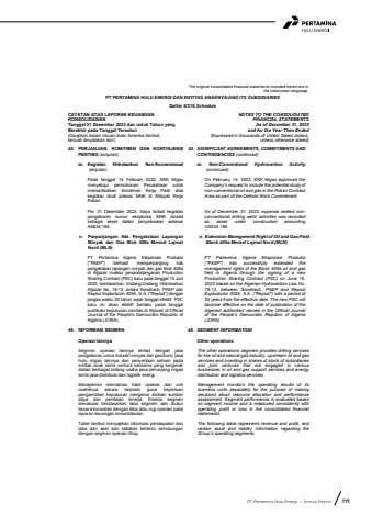 PT Pertamina Hulu Energi %u2022 Annual Report 771The original consolidated financial statements included herein are in the Indonesian language.PT PERTAMINA HULU ENERGI DAN ENTITAS ANAKNYA/AND ITS SUBSIDIARIESDaftar 5/218 ScheduleCATATAN ATAS LAPORAN KEUANGANKONSOLIDASIANTanggal 31 Desember 2023 dan untuk Tahun yang Berakhir pada Tanggal Tersebut(Disajikan dalam ribuan dolar Amerika Serikat,kecuali dinyatakan lain)NOTES TO THE CONSOLIDATEDFINANCIAL STATEMENTSAs of December 31, 2023and for the Year Then Ended(Expressed in thousands of United States dollars,unless otherwise stated)45. PERJANJIAN, KOMITMEN DAN KONTINJENSI PENTING (lanjutan)45. SIGNIFICANT AGREEMENTS, COMMITMENTS AND CONTINGENCIES (continued)m. Kegiatan Hidrokarbon Non-Konvensional(lanjutan)m. Non-Conventional Hydrocarbon Activity(continued)Pada tanggal 14 Februari 2022, SKK Migas menyetujui permohonan Perusahaan untuk memanfaatkan Komitmen Kerja Pasti atas kegiatan studi potensi MNK di Wilayah Kerja Rokan.On February 14, 2022, SKK Migas approved the Company%u2019s request to include the potential study of non-conventional oil and gas in the Rokan Contract Area as part of the Definite Work Commitment.Per 31 Desember 2023, biaya terkait kegiatan pengeboran sumur eksplorasi MNK dicatat sebagai asset dalam penyelesaian sebesar AS$34.184.As of December 31, 2023, expense related nonconventional drilling wells%u2019 activities was recorded as asset under construction amounting US$34,184.n. Perpanjangan Hak Pengelolaan Lapangan Minyak dan Gas Blok 405a Menzel Lejmat Nord (MLN)n. Extension Management Right of Oil and Gas Field Block 405a Menzel Lejmat Nord (MLN)PT Pertamina Algeria Eksplorasi Produksi (\berhasil memperpanjang hak pengelolaan lapangan minyak dan gas Blok 405a di Aljazair melalui penandatanganan Production Sharing Contract (PSC) baru pada tanggal 15 Juni 2023 berdasarkan Undang-Undang Hidrokarbon Aljazair No. 19-13, antara Sonatrach, PAEP dan Repsol Exploraci%u00f3n 405A, S.A. (\jangka waktu 25 tahun sejak tanggal efektif. PSC baru ini akan efektif berlaku pada tanggal publikasi keputusan otoritas di Aljazair di Official Journal of the People's Democratic Republic of Algeria (JORA).PT Pertamina Algeria Eksplorasi Produksi (\has successfully extended the management rights of the Block 405a oil and gas field in Algeria through the signing of a new Production Sharing Contract (PSC) on June 15, 2023 based on the Algerian Hydrocarbon Law No. 19-13, between Sonatrach, PAEP and Repsol Exploraci%u00f3n 405A, S.A. (\25 years from the effective date. The new PSC will become effective on the date of publication of the Algerian authorities' decree in the Official Journal of the People's Democratic Republic of Algeria (JORA).46. INFORMASI SEGMEN 46. SEGMENT INFORMATIONOperasi lainnya Other operationsSegmen operasi lainnya terkait dengan jasa pengeboran untuk industri minyak dan gas bumi, jasa hulu migas lainnya dan penyertaan saham pada entitas anak serta ventura bersama yang bergerak dalam berbagai bidang usaha jasa penunjang migas serta jasa distribusi dan logistik energi.Manajemen memantau hasil operasi dari unit usahanya secara terpisah guna keperluan pengambilan keputusan mengenai alokasi sumber daya dan penilaian kinerja. Kinerja segmen dievaluasi berdasarkan laba segmen dan diukur secara konsisten dengan laba atau rugi operasi pada laporan keuangan konsolidasian.Tabel berikut menyajikan informasi pendapatan dan laba dan aset dan liabilitas tertentu sehubungan dengan segmen operasi Grup.The other operations segment provides drilling services for the oil and natural gas industry, upstream oil and gas services and investing in shares of stock of subsidiaries and joint ventures that are engaged in various businesses in oil and gas support services and energy distribution and logistics services.Management monitors the operating results of its business units separately for the purpose of making decisions about resource allocation and performance assessment. Segment performance is evaluated based on segment income and is measured consistently with operating profit or loss in the consolidated financial statements.The following table represents revenue and profit, and certain asset and liability information regarding the Group%u2019s operating segments.