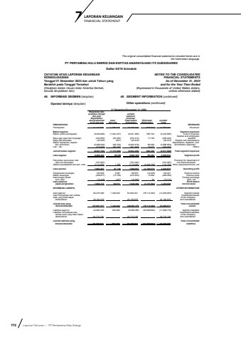 772 Laporan Tahunan %u2022 PT Pertamina Hulu EnergiLAPORAN KEUANGAN 7 FINANCIAL STATEMENTThe original consolidated financial statements included herein are in the Indonesian language.PT PERTAMINA HULU ENERGI DAN ENTITAS ANAKNYA/AND ITS SUBSIDIARIESDaftar 5/219 ScheduleCATATAN ATAS LAPORAN KEUANGANKONSOLIDASIANTanggal 31 Desember 2023 dan untuk Tahun yang Berakhir pada Tanggal Tersebut(Disajikan dalam ribuan dolar Amerika Serikat,kecuali dinyatakan lain)NOTES TO THE CONSOLIDATEDFINANCIAL STATEMENTSAs of December 31, 2023and for the Year Then Ended(Expressed in thousands of United States dollars,unless otherwise stated)46. INFORMASI SEGMEN (lanjutan) 46. SEGMENT INFORMATION (continued)Operasi lainnya (lanjutan) Other operations (continued) 31 Desember/December 31, 2023 Eksplorasi danproduksi minyak Jumlahdan gas/ sebelumExploration eliminas/and production Jasa/ Total before Eliminasi/ Jumlah/of oil and gas Services elimination Elimination TotalPENDAPATAN REVENUESPendapatan 14.147.008 1.258.318 15.405.326 (836.942) 14.568.384 RevenuesBeban segmen Segment expensesBeban pokok pendapatan (5.000.828) (1.020.437) (6.021.265) 786.700 (5.234.565) Cost of revenuesSalaries and employeesBiaya gaji upah dan tunjangan (433.830) (38.383) (472.213) 17.190 (455.023) benefitsBiaya pemeliharaan (45.345) (627) (45.972) - (45.972) Repairs and maintenanceBeban depresiasi, deplesi Depreciation, depletion, anddan amortisasi (2.856.539) (86.379) (2.942.918) 86.064 (2.856.854) amortization expensesLain - lain (315.222) (26.702) (341.924) 16.472 (325.452) OthersJumlah beban segmen (8.651.764) (1.172.528) (9.824.292) 906.426 (8.917.866) Total segment expensesLaba segmen 5.495.244 85.790 5.581.034 69.484 5.650.518 Segment profitPenyisihan penurunan nilai Provision for impairment ofaset non-keuangan (707.087) - (707.087) - (707.087) non-financial assets(Beban)/pendapatan lain-lain, neto 3.114.650 1.356 3.116.006 (3.228.758) (112.752) Other (expense)/income, netLaba operasi 7.902.807 87.146 7.989.953 (3.159.274) 4.830.679 Operating profitPenghasilan keuangan 145.636 6.991 152.627 (12.220) 140.407 Finance incomeBeban keuangan (459.677) (13.156) (472.833) 13.548 (459.285) Finance costsKeuntungan selisih Foreign exchange kurs, neto (19.448) (407) (19.855) 83 (19.772) gain, netLaba sebelum Profit beforepajak penghasilan 7.569.318 80.574 7.649.892 (3.157.863) 4.492.029 income taxesINFORMASI LAINNYA OTHER INFORMATIONAset segmen 62.476.099 1.346.202 63.822.301 (78.114.364) (14.292.063) Segment assetsAset Perusahaan dan entitas Unallocated assetsanak yang tidak dapat of the Companydialokasikan 45.180.978 - 45.180.978 - 45.180.978 and subsidiariesJumlah aset yang Total consolidateddikonsolidasikan 107.657.077 1.346.202 109.003.279 (78.114.364) 30.888.915 assetsLiabilitas segmen 44.996.405 593.480 45.589.885 (63.589.664) (17.999.779) Segment liabilitiesLiabilitas Perusahaan dan Unallocated liabilitiesentitas anak yang tidak dapat of the Companydialokasikan 34.710.139 - 34.710.139 - 34.710.139 and subsidiariesJumlah liabilitas yang Total consolidateddikonsolidasikan 79.706.544 593.480 80.300.024 (63.589.664) 16.710.360 liabilities