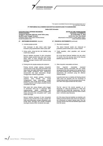 776 Laporan Tahunan %u2022 PT Pertamina Hulu EnergiLAPORAN KEUANGAN 7 FINANCIAL STATEMENTThe original consolidated financial statements included herein are in the Indonesian language.PT PERTAMINA HULU ENERGI DAN ENTITAS ANAKNYA/AND ITS SUBSIDIARIESDaftar 5/223 ScheduleCATATAN ATAS LAPORAN KEUANGANKONSOLIDASIANTanggal 31 Desember 2023 dan untuk Tahun yang Berakhir pada Tanggal Tersebut(Disajikan dalam ribuan dolar Amerika Serikat, kecuali dinyatakan lain)NOTES TO THE CONSOLIDATEDFINANCIAL STATEMENTS As of December 31, 2023and for the Year Then Ended(Expressed in thousands of United States dollars,unless otherwise stated)47. INSTRUMEN KEUANGAN (lanjutan) 47. FINANCIAL INSTRUMENTS (continued)2. Investasi jangka pendek 2. Short-term investmentAset keuangan di atas diukur pada hargakuotasian yang dipublikasikan dalam pasar aktif.The above financial assets are measured atpublished quoted market price in active market.3. Utang usaha, utang lain-lain dan liabilitas yangmasih harus dibayar.3. Trade payables, other payables and accruedliabilities.Seluruh liabilitas keuangan di atas merupakanliabilitas jangka pendek yang akan jatuh tempodalam waktu 12 bulan sehingga nilai tercatatliabilitas keuangan tersebut telah mencerminkannilai wajar.All of the above financial liabilities are due within12 months, thus the carrying value of the financialliabilities approximate their fair value.4. Piutang lain-lain jangka panjang dan pinjaman 4. Other long-term receivables and loansPiutang lain-lain jangka panjang merupakanpiutang tanpa bunga yang pada pencatatan awaldiakui pada nilai wajar berdasarkan bunga pasarpada tanggal pengakuan awal. Selanjutnya,penyesuaian nilai wajar diamortisasi denganmenggunakan metode bunga efektif.Other long-term receivables representnon-interest bearing receivables that are initiallyrecognized at fair value based on the market rate on their initial recognition date. Subsequently, fair value adjustments are amortized using the effectiveinterest method.Pinjaman bank jangka panjang merupakanpinjaman yang memiliki suku bungamengambang yang disesuaikan denganpergerakan suku bunga pasar sehingga jumlahterutang pinjaman bank jangka panjang tersebutmendekati nilai wajar.Long-term bank loan is a liability with floating interest rates which are adjusted with the movement ofmarket interest rates, thus the carrying value of longterm bank loans approximate their fair values.Nilai wajar dari utang obligasi pada tanggal31 Desember 2023 dan 31 Desember 2022masing-masing adalah AS$45.250 danAS$44.758. Nilai wajar ini dihitung menggunakanharga penawaran dan merupakan level 1 padahirarki nilai wajar.The fair value of the bonds payable as at December 31, 2023 and December 31, 2022 were US$45,250 and US$44,758, respectively. The fair value is calculated using the bid price which is within level 1 of the fair value hierarchy.Seluruh liabilitas keuangan di atas merupakanpinjaman yang memiliki suku bunga variabel dantetap yang disesuaikan dengan pergerakan sukubunga pasar sehingga nilai tercatat kewajibankeuangan tersebut telah mendekati nilai wajar.All of the above financial liabilities are liabilities with floating and fixed interest rates which are adjusted in the movements of market interest rates, thus the carrying values of the financial liabilities approximate their fair values.