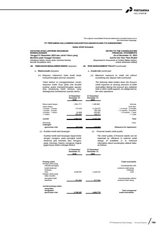 PT Pertamina Hulu Energi %u2022 Annual Report 783The original consolidated financial statements included herein are in the Indonesian language.PT PERTAMINA HULU ENERGI DAN ENTITAS ANAKNYA/AND ITS SUBSIDIARIESDaftar 5/230 ScheduleCATATAN ATAS LAPORAN KEUANGANKONSOLIDASIANTanggal 31 Desember 2023 dan untuk Tahun yang Berakhir pada Tanggal Tersebut(Disajikan dalam ribuan dolar Amerika Serikat,kecuali dinyatakan lain)NOTES TO THE CONSOLIDATEDFINANCIAL STATEMENTSAs of December 31, 2023and for the Year Then Ended(Expressed in thousands of United States dollars,unless otherwise stated)49. KEBIJAKAN MANAJEMEN RISIKO (lanjutan) 49. RISK MANAGEMENT POLICY (continued)c. Risiko kredit (lanjutan) c. Credit risk (continued)(iv) Eksposur maksimum risiko kredit tanpa memperhitungkan jaminan (lanjutan)(iv) Maximum exposure to credit risk without considering any deposit held (continued)Tabel berikut ini menggambarkan rincian eksposur kredit Grup pada nilai tercatatpiutang usaha (memperhitungkan agunan atau pendukung kredit lainnya), yang dikategorikan berdasarkan operasi utama.The following table breaks down the Group%u2019s credit exposure at carrying amounts of trade receivables (taking into account any collateral held or other credit support), as categorised by the main operations.31 Desember/ 31 Desember/December 31, December 31,2023 2022Belum jatuh tempo 1.654.717 1.206.962 Not dueJatuh tempo: Over due:>0 bulan - 3 bulan 172.323 2.125.573 > 0 month - 3 months>3 bulan - 6 bulan - 766.168 > 3 months - 6 months>6 bulan - 1 tahun 50.808 833.891 > 6 months - 1 year>1 tahun 982.895 169.771 > 1 yearJumlah 2.860.743 5.102.365 TotalDikurangi: Less:Cadanganpenurunan nilai (92.346) 138.587 Allowance for impairment(v) Kualitas kredit aset keuangan (v) Financial assets credit qualityKualitas kredit aset keuangan dapat dinilaidengan mengacu pada peringkat kredit eksternal (jika tersedia) atau mengacu pada informasi historis mengenai tingkat gagal bayar debitur sebagai berikut:The credit quality of financial assets can be assessed by reference to external credit ratings (if available) or to historical information about counterparty default rates, as follows:31 Desember/ 31 Desember/December 31, December 31,2023 2022Piutang usaha Trade receivablesDengan pihak yangmemiliki peringkat Counterparties withkredit eksternal external credit rating(Pefindo) (Pefindo)AAA 2.006.597 4.446.274 AAADengan pihak yangtidak memilikiperingkat kredit Counterparties withouteksternal 761.800 517.504 external credit ratingJumlah piutang usahayang tidakmengalami Total unimpairedpenurunan nilai 2.768.397 4.963.778 trade receivables