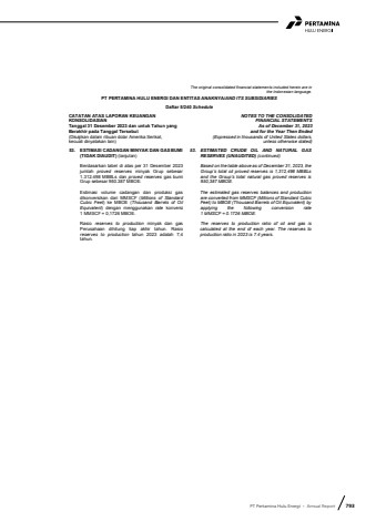 PT Pertamina Hulu Energi %u2022 Annual Report 793The original consolidated financial statements included herein are in the Indonesian language.PT PERTAMINA HULU ENERGI DAN ENTITAS ANAKNYA/AND ITS SUBSIDIARIESDaftar 5/240 ScheduleCATATAN ATAS LAPORAN KEUANGANKONSOLIDASIANTanggal 31 Desember 2023 dan untuk Tahun yang Berakhir pada Tanggal Tersebut(Disajikan dalam ribuan dolar Amerika Serikat, kecuali dinyatakan lain)NOTES TO THE CONSOLIDATEDFINANCIAL STATEMENTS As of December 31, 2023and for the Year Then Ended(Expressed in thousands of United States dollars,unless otherwise stated)53. ESTIMASI CADANGAN MINYAK DAN GAS BUMI (TIDAK DIAUDIT) (lanjutan)53. ESTIMATED CRUDE OIL AND NATURAL GASRESERVES (UNAUDITED) (continued)Berdasarkan tabel di atas per 31 Desember 2023jumlah proved reserves minyak Grup sebesar1.312.498 MBBLs dan proved reserves gas bumiGrup sebesar 950.387 MBOE.Based on the table above as of December 31, 2023, the Group%u2019s total oil proved reserves is 1,312,498 MBBLsand the Group%u2019s total natural gas proved reserves is950,387 MBOE.Estimasi volume cadangan dan produksi gasdikonversikan dari MMSCF (Millions of StandardCubic Feet) ke MBOE (Thousand Barrels of OilEquivalent) dengan menggunakan rate konversi 1 MMSCF = 0,1726 MBOE.The estimated gas reserves balances and productionare converted from MMSCF (Millions of Standard Cubic Feet) to MBOE (Thousand Barrels of Oil Equivalent) by applying the following conversion rate1 MMSCF = 0.1726 MBOE.Rasio reserves to production minyak dan gasPerusahaan dihitung tiap akhir tahun. Rasioreserves to production tahun 2023 adalah 7,4tahun.The reserves to production ratio of oil and gas iscalculated at the end of each year. The reserves toproduction ratio in 2023 is 7.4 years.