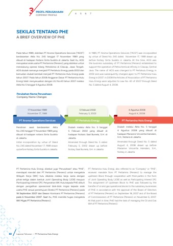 82Diubah melalui Akta No. 5 tanggal 4 Agustus 2008 yang dibuat di hadapan Marianne Vincentia Hamdani, S.H., Notaris di Jakarta.Amended through Deed No. 5 dated August 4, 2008 drawn up before Marianne Vincentia Hamdani, S.H., Notary in Jakarta.Pada tahun 1989, didirikan PT Aroma Operations Services (%u201cAOS%u201d) berdasarkan Akta No. 245 tanggal 17 November 1989 yang dibuat di hadapan Notaris Sinta Susikto di Jakarta. Saat itu, AOS merupakan anak usaha PT Pertamina (Persero) yang didirikan untuk mendukung operasi kilang Petrokimia di Cilacap, Jawa Tengah. AOS diubah namanya menjadi PT Pertahulu Energy pada 2002 dan kemudian diubah kembali menjadi PT Pertamina Hulu Energi pada tahun 2007. Pada tahun 2008 Anggaran Dasar PT Pertamina Hulu Energi telah menyesuaikan dengan UU No.40 tahun 2007 melalui Akta No 5 tanggal 4 Agustus 2008.In 1989, PT Aroma Operations Services (%u201cAOS%u201d) was incorporated by virtue of Deed No. 245 dated November 17, 1989 drawn up before Notary Sinta Susikto in Jakarta. At the time, AOS was the business subsidiary of PT Pertamina (Persero) established to support the operation of Petrochemical refinery in Cilacap, Central Java. The name of AOS was changed to PT Pertahulu Energy in 2002 and was subsequently changed again to PT Pertamina Hulu Energi in 2007. In 2008 the Articles of Association of PT Pertamina Hulu Energi were adjusted to Law No. 40 of 2007 through Deed No. 5 dated August 4, 2008.SEKILAS TENTANG PHEA BRIEF OVERVIEW OF PHEPerubahan Nama PerusahaanCompany Name Changes4 Agustus 2008August 4, 2008PT Pertamina Hulu Energi5 Februari 2002February 5, 2002PT Pertahulu EnergyDiubah melalui Akta No. 5 tanggal 5 Februari 2002 yang dibuat di hadapan Notaris Saal Bumela, S.H. di Jakarta.Amended through Deed No. 5 dated February 5, 2002 drawn up before Notary Saal Bumela, S.H. in Jakarta.17 November 1989November 17, 1989PT Aroma Operations ServicesPendirian awal berdasarkan Akta No. 245 tanggal 17 November 1989 yang dibuat di hadapan notaris Sinta Susikto di Jakarta.Initial incorporation by virtue of Deed No. 245 dated November 17, 1989 drawn up before Notary Sinta Susikto in Jakarta.PT Pertamina Hulu Energi, disebut juga %u201cPerusahaan%u201d atau %u201cPHE%u201d, mendapat mandat dari PT Pertamina (Persero) untuk mengelola Wilayah Kerja (WK) hulu dikelola melalui kerja sama dengan pihak ketiga dalam bentuk Joint Operating Body (JOB) maupun Participating Interest (PI). Penyerahan WK Hulu kepada PHE diikuti dengan pengalihan operasional blok-blok migas kepada anak usaha PHE sesuai persetujuan Direksi PT Pertamina (Persero) pada 18 September 2007 dan Dewan Komisaris PT Pertamina (Persero) pada 6 November 2007. Saat itu, PHE memiliki tugas mengelola WK Migas PT Pertamina (Persero).PT Pertamina Hulu Energi, also referred to as %u201cCompany%u201d or %u201cPHE%u201d, received mandate from PT Pertamina (Persero) to manage the upstream Block through cooperation with third partes in the form of Joint Operating Body (JOB) as well as Participating Interest (PI). The assignment of Upstream Block to PHE was followed by the transfer of oil and gas operational blocks to the subsidiary businesses of PHE in accordance with the approval of the Board of Directors of PT Pertamina (Persero) on September 18, 2007 and of the Board of Commissioners of PT Pertamina (Persero) on November 6, 2007. At that point in time, PHE had the task of managing the Oil and Gas WA of PT Pertamina (Persero).Laporan Tahunan %u2022 PT Pertamina Hulu EnergiPROFIL PERUSAHAANCOMPANY PROFILE 3 4 5 6 7