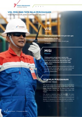 84Menjadi perusahaan minyak dan gas bumi kelas dunia.To become a world-class oil and gas company.VISIVisionMISIMissionMelaksanakan pengelolaan operasi dan portofolio usaha sektor hulu minyak dan gas bumi secara profesional, dan berdaya laba tinggi, serta memberikan nilai tambah bagistakeholders.To manage operations and business portfolios of the upstream oil and gas sector in a professional and high-profit manner and to provide added value to stakeholders.TATA NILAI PERUSAHAANCorporate Values84 Laporan Tahunan %u2022 PT Pertamina Hulu EnergiPHE memiliki budaya yang menjadi budaya seluruh perusahaan BUMN sesuai dengan Surat Edaran Menteri Badan Usaha Milik Negara Republik Indonesia No. SE-7/MBU/07/2020 tentang Nilai-Nilai Utama Sumber Daya Manusia Badan Usaha Milik Negara.PHE upholds a corporate culture that aligns with the values of all state-owned enterprises (SOEs) in accordance with the Circular Letter of the Minister of State-Owned Enterprises of the Republic of Indonesia No. SE-7/MBU/07/2020 concerning the Core Values of Human Resources in State-Owned Enterprises.VISI, MISI, DAN TATA NILAI PERUSAHAANVISION, MISSION, AND CORPORATE VALUESPROFIL PERUSAHAANCOMPANY PROFILE 3 4 5 6 7