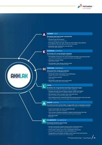 AMANAH TRUSTMemegang teguh kepercayaan yang diberikanTo uphold the trust given%u2022 Memenuhi janji dan komitmenFulfill the pledge and Commitment%u2022 Bertanggung jawab atas tugas, keputusan, dan tindakan yang dilakukanResponsible for the task, decision and action that taken%u2022 Berpegang teguh kepada nilai moral dan etikaStick to the value and ethicAKOMPETEN COMPETENTTerus belajar dan mengembangkan kapabilitasContinuously to learn and develop capabilities%u2022 Meningkatkan kompetensi diri untuk menjawab tantangan yang selalu berubahImprove self-competence to respond to every new challenges%u2022 Membantu orang lain belajarHelp others to learn%u2022 Menyelesaikan tugas dengan kualitas terbaikComplete the task with highest qualityKHARMONIS HARMONIOUSSaling peduli dan menghargai perbedaanCare and respect for the differences%u2022 Menghargai setiap orang apapun latar belakangnyaRespect everyone or their background%u2022 Suka menolong orang lainHelp others%u2022 Membangun lingkungan kerja yang kondusifCreate a conducive work environmentHLOYAL Berdedikasi dan mengutamakan kepentingan bangsa dan negaraDedicated and prioritize the interest of nation and state%u2022 Menjaga nama baik sesama Pekerja, pimpinan, BUMN, dan NegaraMaintain the reputation of employees, leaders, BUMN and state%u2022 Rela berkorban untuk mencapai tujuan yang lebih besarAble to sacrifice to achieve the greater goal%u2022 Patuh kepada pimpinan sepanjang tidak bertentangan dengan hukum dan etikaObey to leader as long as it is not against the law and ethicLADAPTIF ADAPTIVETerus berinovasi dan antusias dalam menggerakkan atau menghadapi perubahanContinuously to innovate and be enthusiastic in movement or facing the change%u2022 Cepat menyesuaikan diri untuk menjadi lebih baikResponsive to adjust for the better%u2022 Terus menerus melakukan perbaikan mengikuti perkembangan teknologiContinuously improving to follow the technology development%u2022 Bertindak proaktifProactiveAKOLABORATIF COLLABORATIVEMembangun kerjasama yang sinergisBuild synergistic cooperation%u2022 Memberi kesempatan kepada berbagai pihak untuk berkontribusiProvide the opportunities for various parties to contribute%u2022 Terbuka dalam bekerja sama untuk menghasilkan nilai tambahBe open in working together to generate added value%u2022 Menggerakkan pemanfaatan berbagai sumber daya untuk tujuan bersamaMobilize the use of resource for common goalsKPT Pertamina Hulu Energi %u2022 Annual Report 85