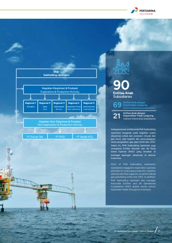 PT Pertamina Hulu Energi %u2022 Annual Report 7PHE Subholding UpstreamKegiatan Eksplorasi & ProduksiExploration & Production ActivityRegional 1 Regional 2 Regional 3 Regional 4 Regional 5Sumatra JawaJavaKalimantanBorneoIndonesia TimurEast IndonesiaInternasionalInternationalKegiatan Non-Eksplorasi & ProduksiNon-exploration & Production ActivityPT Elnusa Tbk PT PDSI PT Badak NGLSebagian besar entitas anak PHE Subholding Upstream bergerak pada kegiatan usaha eksplorasi untuk dan produksi minyak dan gas bumi, jasa logistik dan penunjangnya, serta pengolahan gas alam (LNG dan LPG). Selain itu, PHE Subholding Upstream juga mengelola Entitas Asosiasi dan 26 Kerja Sama Operasi (KSO) yang tersebar di berbagai lapangan eksplorasi di seluruh Indonesia.Most of PHE Subholding Upstream's subsidiaries engaged in exploration business activities for oil and gas production, logistics services and their supports, as well as natural gas processing (LNG and LPG). In addition, PHE Subholding Upstream also manages Associate Entities and 26 Operational Cooperation (KSO) spread across various exploration fields throughout Indonesia.90Entitas AnakSubsidiaries69 Entitas Anak dengan Kepemilikan LangsungDirect Ownership Subsidiaries21 Entitas Anak dengan Kepemilikan Tidak LangsungIndirect Ownership SubsidiariesPT Pertamina Hulu Energi %u2022 Annual Report 7