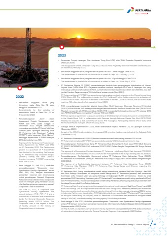 %u2022 Perubahan anggaran dasar yang tercantum pada Akta No. 12 pada tanggal 3 November 2022.Amendments to the articles of association listed in Deed No. 12 on 3 November 2022.%u2022 Penandatanganan Asset Sales Agreement Proyek Tambourine oleh PIREP dan EMIL pada tanggal 31 Desember 2022. Proyek Tambourine merupakan pembelian PI ExxonMobil Iraq Limited pada lapangan eksisting milik PT Pertamina Irak Eksplorasi Produksi (%u201cPIREP%u201d) yaitu Lapangan West Qurna-1 sehingga kepemilikan PI PIREP menjadi 20% dari sebelumnya 10%.Signing of the Tambourine Project Asset Sales Agreement by PIREP and EMIL on 31 December 2022. The Tambourine project is a purchase of PI ExxonMobil Iraq Limited in the existing field owned by PT Pertamina Iraq Eksplorasi Ekspor (%u201cPIREP%u201d), namely the West Qurna-1, thereby increasing PI PIREP%u2019s ownership from 10% to 20%.%u2022 Pada tanggal 10 Juni 2022, dilakukan penandatanganan %u201cCorporate Loan Syndication Facility Agreement%u201d antara PHE, PEP, PHI, dengan konsorsium perbankan nasional dan internasional untuk pembiayaan General Corporate Purposes senilai USD2,5 miliar. Corporate Loan ini menjadi yang terbesar secara nilai fasilitas pinjaman sepanjang sejarah Corporate Loan di Indonesia.On June 10, 2022, a Corporate Loan Syndication Facility Agreement was signed between PHE, PEP, PHI and a consortium of national and international banks for General Corporate Purposes financing worth USD2.5 billion. This Corporate Loan is the largest in terms of facility amount in the history of Corporate Loans in Indonesia.20222023%u2022 Peresmian Proyek Lapangan Gas Jambaran Tiung Biru (JTB) oleh Wakil Presiden Republik Indonesia (Februari 2023). The inauguration of the Jambaran Tiung Biru (JTB) Gas Field Project by the Vice President of the Republic of Indonesia (February 2023).%u2022 Perubahan anggaran dasar yang tercantum pada Akta No. 1 pada tanggal 2 Mei 2023.The amendment to the articles of association as stated in Deed No. 1 on May 2, 2023.%u2022 Perubahan anggaran dasar yang tercantum pada Akta No. 20 pada tanggal 3 Mei 2023.The amendment to the articles of association as stated in Deed No. 20 on May 3, 2023.%u2022 PT Pertamina Algeria EP (PAEP) menandatangani kontrak baru perpanjangan hidrokarbon di Menzel Lejmat Nord (MLN) Blok 405. Kerjasama tersebut meliputi Lapangan MLN dan 9 Lapangan lain yang mencakup unitisasi Ourhoud dan El Merk. Jumlah total investasi diperkirakan lebih dari USD 800 Juta dan jumlah Sumber Daya mencapai 150 Juta Barrel setara minyak (Juni 2023). PT Pertamina Algeria EP (PAEP) has signed a new hydrocarbon contract extension in the Menzel Lejmat Nord (MLN) Block 405. The collaboration includes the MLN field and 9 other fields covering the unitization of Ourhoud and El Merk. The total investment is estimated to exceed USD 800 million, with total resources reaching 150 million barrels of oil equivalent (June 2023).%u2022 PHE menandatangani perjanjian akuisisi kepemilikan Shell Upstream Overseas Services (I) Limited (SUOS) di Blok Masela. PHE bekerjasama dengan Petronas melalui Petronas Masela Sdn. Bhd. (PETRONAS Masela) mengambil alih 35% kepemilikan SUOS. PHE mengelola Participating Interest (PI) sebesar 20% dan PETRONAS Masela mengelola PI sebesar 15% (Juli 2023). PHE has signed an agreement to acquire ownership of Shell Upstream Overseas Services (I) Limited (SUOS) in the Masela Block. PHE, in collaboration with Petronas through Petronas Masela Sdn. Bhd. (PETRONAS Masela), has acquired a 35% ownership of SUOS. PHE manages a Participating Interest (PI) of 20%, while PETRONAS Masela manages a PI of 15% (July 2023). %u2022 Sebagai bentuk implementasi CCUS, telah dilaksanakan Injeksi Perdana CO2 di Lapangan Sukowati (Desember 2023).As part of the CCUS implementation, the inaugural CO2 injection has been carried out at the Sukowati Field (December 2023).%u2022 PT Pertamina International EP (PIEP) Berhasil menambahkan Participating Interest 10% di Irak.PT Pertamina International EP (PIEP) has successfully added a 10% Participating Interest in Iraq.%u2022 Penandatanganan Kontrak Kerja Sama PT Pertamina Hulu Energi North East Java (PHE NEJ) Bersama PT POSCO INTERNATIONAL ENP Indonesia (POSCO ENP) Dalam Rangka Pengelolaan WK Bunga Selama 30 Tahun.The signing of a Cooperation Contract between PT Pertamina Hulu Energi North East Java and PT POSCO INTERNATIONAL ENP Indonesia (POSCO ENP) for the Management of the Bunga Working Area for 30 Years.%u2022 Penandatanganan Confidentiality Agreement antara PT Pertamina Hulu Kalimantan Timur (PHKT), PT Pertamina Hulu Mahakam (PHM), PT Pertamina Hulu Sanga-Sanga, Dan Chevron terkait Pengembangan CCS/CCUS. The signing of a Confidentiality Agreement between PT Pertamina Hulu Kalimantan Timur (PHKT), PT Pertamina Hulu Mahakam (PHM), PT Pertamina Hulu Sanga-Sanga, and Chevron regarding the Development of CCS/CCUS.%u2022 PT Pertamina Hulu Energi mendapatkan credit rating internasional perdana Baa2 dari Moody's dan BBB dari Fitch Ratings. Pencapaian ini menyamai credit rating untuk PT Pertamina (persero) dan Indonesia%u2019s Sovereign, serta menjadi salah satu yang tertinggi di lingkungan BUMN di Indonesia. Selain itu, anak perusahaan PHE Subholding Upstream yaitu PT Pertamina EP mendapatkan credit rating perdana AAA(idn) dan PT Pertamina Hulu Indonesia medapatkan credit rating Perdana AA+(idn) yang keduanya diberikan oleh Lembaga Pemeringkat Fitch Rating Indonesia.PT Pertamina Hulu Energi has achieved its inaugural international credit rating of Baa2 from Moody's and BBB from Fitch Ratings. This accomplishment matches the credit ratings of PT Pertamina (Persero) and Indonesia's Sovereign, positioning it among the highest-rated entities within the state-owned enterprises (SOEs) sector in Indonesia. Furthermore, its subsidiary, PHE Subholding Upstream, specifically PT Pertamina EP, has received an inaugural credit rating of AAA(idn), while PT Pertamina Hulu Indonesia has received an inaugural credit rating 