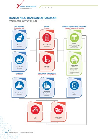 96RANTAI NILAI DAN RANTAI PASOKANVALUE AND SUPPLY CHAINUnit ProduksiProduction UnitProdukProductPelanggan CustomerDistribusi & TransportasiDistribution & TransportationFasilitas Penyimpanan & ProduksiStorage Production & FacilitiesMinyak MentahCruide OilLepas Pantai Offshore%u2022 Floating Storage &Offloading (FSO)%u2022 Floating Production Storage & Offloading (FPSO)Daratan, Tangki PenampunganOnshoreReservoir TankDaratanOnshoreGas BumiNatural GasKilang PertaminaRefineryLepas PantaiOffshoreEksporExportPerusahaan Nasional LainOther National CompanyPipaPipeKapal TankerTankerLaporan Tahunan %u2022 PT Pertamina Hulu EnergiPROFIL PERUSAHAANCOMPANY PROFILE 3 4 5 6 7