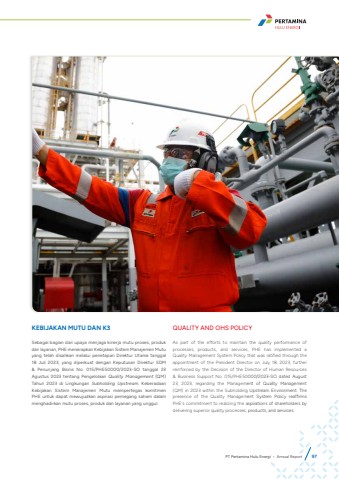 KEBIJAKAN MUTU DAN K3Sebagai bagian dari upaya menjaga kinerja mutu proses, produk dan layanan, PHE menerapkan Kebijakan Sistem Manajemen Mutu yang telah disahkan melalui penetapan Direktur Utama tanggal 18 Juli 2023, yang diperkuat dengan Keputusan Direktur SDM & Penunjang Bisnis No. 015/PHE50000/2023-SO tanggal 23 Agustus 2023 tentang Pengelolaan Quality Management (QM) Tahun 2023 di Lingkungan Subholding Upstream. Keberadaan Kebijakan Sistem Manajemen Mutu mempertegas komitmen PHE untuk dapat mewujudkan aspirasi pemegang saham dalam menghadirkan mutu proses, produk dan layanan yang unggul.QUALITY AND OHS POLICY As part of the efforts to maintain the quality performance of processes, products, and services, PHE has implemented a Quality Management System Policy that was ratified through the appointment of the President Director on July 18, 2023, further reinforced by the Decision of the Director of Human Resources & Business Support No. 015/PHE50000/2023-SO dated August 23, 2023, regarding the Management of Quality Management (QM) in 2023 within the Subholding Upstream Environment. The presence of the Quality Management System Policy reaffirms PHE's commitment to realizing the aspirations of shareholders by delivering superior quality processes, products, and services.PT Pertamina Hulu Energi %u2022 Annual Report 97