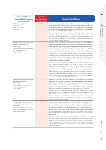Kegiatan Usaha Menurut Anggaran DasarBusiness Activities According to Articles of AssociationSudah / Belum DijalankanHas Been / Has Not Been UndertakenKegiatan Usaha yang DijalankanBusiness Activities UndertakenPertambangan gas alam (KBLI 06201)Natural Gas Mining (KBLI 06201)%uf0fc Kegiatan usaha yang dilakukan mencakup usaha pencarian kandungan gas alam, pengeboran, penambangan, pemisahan serta penampungan. Hasil pertambangan gas alam antara lain gas alam. Pencairan gas alam menjadi LNG sampai kepengapalannya masih termasuk kegiatan pertambangan. Termasuk kegiatan CBM (Coalbed Methane).Business activities undertaken include undertakings to find natural gas content, drilling, mining, separation and storage. The products of natural gas mining include, among others, natural gas. Liquefaction of natural gas into LNG until its shipment are still included in mining activities. Including CBM (Coalbed Methane) activities.Aktivitas penunjang pertambangan minyak bumi dan gas alam (KBLI 09100)Supporting Activities for Petroleum and Natural Gas Mining (KBLI 09100)%uf0fc Kegiatan usaha yang dilakukan mencakup kegiatan jasa yang berkaitan dengan pertambangan minyak dan gas bumi yang dilakukan atas dasar balas jasa (fee) atau kontrak, seperti jasa eksplorasi pengambilan minyak atau gas dengan cara tradisional yaitu membuat observasi geologi, pemasangan alat pengeboran, perbaikan dan pembongkaran penyemenan sumur minyak dan sumur gas, pembuatan saluran sumur, pemompaan sumur produksi, penyumbatan dan penutupan sumur produksi, pengujian produksi, dismantling, pencairan dan regasifikasi gas alam untuk kebutuhan transportasi di lokasi pertambangan, pengeboran percobaan dalam rangka penyulingan minyak bumi dan gas alam dan jasa pemadam kebakaran ladang minyak bumi dan gas alam.Business activities undertaken include service activities related to oil and natural gas mining carried out on a fee or contract basis, such as traditional oil or gas exploration services, namely geological observations, installment of drilling equipment, reparation of and dismantling of oil and gas well cementing, creation of well channels, pumping of production wells, plug and closure of production wells, production testing, dismantling, liquefaction and regasification of natural gas for transportation needs at mining locations, trial drilling for the purpose of refining oil and natural gas, and oil and natural gas field firefighting services.Aktivitas penunjang pertambangan dan penggalian lainnya (KBLI 09900)Other Supporting Activities for Mining and Excavations (KBLI 09900)%uf0fc Kegiatan usaha yang dilakukan mencakup jasa penunjang atas dasar balas jasa atau kontrak, yang dibutuhkan dalam kegiatan pertambangan golongan pokok 05, 07, dan 08, seperti jasa eksplorasi misalnya dengan cara tradisional seperti mengambil contoh bijih dan membuat observasi geologi, jasa pemompaan dan penyaluran hasil tambang dan jasa percobaan penggalian dan pengeboran ladang atau sumur tambang.Business activities undertaken include supporting services on a fee or contract basis, which are required in mining activities in the main groups 05, 07, and 08, such as exploration services, for example by traditional means such as retrieval of ore samples and geological observations, pumping and distribution services for mining products and trial excavation and drilling services for mining fields or wells.Perdagangan besar bahan bakar padat, cair dan gas dan produk ybdi (KBLI 4610)Wholesale Trade in Solid, Liquid and Gas Fuels and products related thereto (KBLI 4610)%uf0fc Kegiatan usaha yang dilakukan mencakup usaha perdagangan besar bahan bakar gas, cair, dan padat serta produk sejenisnya, seperti minyak bumi mentah, minyak mentah, bahan bakar diesel, gasoline, bahan bakar oli, kerosin, premium, solar, minyak tanah, batu bara, arang, batu bara, ampas arang batu, bahan bakar kayu, nafta dan bahan bakar lainnya termasuk pula bahan bakar gas, seperti LPG, gas butana dan propana dan minyak semir, minyak pelumas dan produk minyak bumi yang telah dimurnikan.Business activities undertaken include wholesale trade of gas, liquid and solid fuels and similar products, such as petroleum, crude oil, diesel fuel, gasoline, fuel oil, kerosene, premium, gas oil, kerosene, coal, charcoal, coke dregs, wood fuel, naphtha, and other fuels including gas fuel such as LPG, butane and propane gas, and polishing oil, lubricating oil and refined petroleum products.010203 Company Profile Profil Perusahaan04050607 PT Pertamina Hulu Energi 103