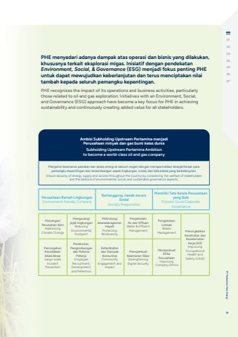 PHE menyadari adanya dampak atas operasi dan bisnis yang dilakukan, khususnya terkait eksplorasi migas. Inisiatif dengan pendekatan Environment, Social, & Governance (ESG) menjadi fokus penting PHE untuk dapat mewujudkan keberlanjutan dan terus menciptakan nilai tambah kepada seluruh pemangku kepentingan.PHE recognizes the impact of its operations and business activities, particularly those related to oil and gas exploration. Initiatives with an Environment, Social, and Governance (ESG) approach have become a key focus for PHE in achieving sustainability and continuously creating added value for all stakeholders.Ambisi Subholding Upstream Pertamina menjadi Perusahaan minyak dan gas bumi kelas duniaSubholding Upstream Pertamina Ambition to become a world-class oil and gas companyMenjamin keamanan pasokan dan akses energi di seluruh negeri dengan memperhatikan kesejahteraan para pemangku kepentingan dan keseimbangan aspek lingkungan, sosial, dan tata kelola yang berkelanjutan.Ensure security of energy supply and access throughout the country by considering the welfare of stakeholders and the balance of environmental, social, and sustainable governance aspects.Perusahaan Ramah LingkunganEnvironment-friendly CompanyBertanggung Jawab secara SosialSocially ResponsibleMemiliki Tata Kelola Perusahaan yang BaikPossess Good Corporate GovernanceMenanganiPerubahan IklimAddressing Climate ChangeMengurangijejak lingkunganReducing Environmental FootprintMelindungikeanekaragaman HayatiProtecting BiodiversityPengelolaanAir dan EffluenWater & Effluent ManagementPengelolaan LimbahWaste Management Meningkatkan Kesehatan dan Keselamatan Kerja (K3)Improving Occupational Health and Safety (OHS)PencegahanKecelakaan Skala BesarLarge-scale Incident PreventionPerekrutan, Pengembangan dan Retensi PekerjaEmployee Recruitment, Development, and Retention Keterlibatan dan Dampak KomunitasCommunity Engagement and ImpactMemperkuatKeamanan SiberStrengthening Digital SecurityMemperkuat EtikaPerusahaanImproving Company Ethics01020304050607Laporan Tahunan %u2022 Annual Report 8PT Pertamina Hulu Energi 9