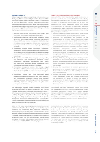Kebijakan Mutu dan K3Sebagai bagian dari upaya menjaga kinerja mutu proses, produk dan layanan, PHE menerapkan Kebijakan Sistem Manajemen Mutu yang telah disahkan melalui penetapan Direktur Utama tanggal 18 Juli 2024. Keberadaan Kebijakan Sistem Manajemen Mutu mempertegas komitmen PHE untuk dapat mewujudkan aspirasi pemegang saham dalam menghadirkan mutu proses, produk dan layanan yang unggul. Sesuai Kebijakan Sistem Manajemen Mutu, Top Management berkomitmen untuk:1. Mematuhi peraturan dan perundangan yang berlaku, serta persyaratan lainnya terkait Sistem Manajemen Mutu.2. Meningkatkan efektivitas dan efisiensi penerapan sistem dan proses kerja melalui kegiatan Continuous Improvement Program (CIP) yang mampu menciptakan nilai tambah bagi Perusahaan, mendorong proses replikasi, dan komersialisasi hasil improvement dan inovasi di lingkungan Subholding Upstream.3. Menerapkan integrasi sistem manajemen, standarisasi, implementasi dan/atau sertifikasi kesisteman berbasis risiko, serta manajemen korespondensi yang mendukung penguatan proses bisnis Perusahaan dalam memenuhi harapan pemangku kepentingan. 4. Menciptakan, mendistribusikan, menyimpan, menggunakan, dan melindungi aset pengetahuan Perusahaan melalui implementasi manajemen pengetahuan yang efektif dan membangun ekosistem berbagi pengetahuan untuk meningkatkan keunggulan kompetitif Perusahaan.5. Memastikan terwujudnya proses dan kinerja unggul Perusahaan melalui implementasi persyaratan Kriteria Kinerja Ekselen Pertamina (KKEP) secara konsisten dan berkelanjutan.6. Menyediakan sumber daya yang dibutuhkan dalam menerapkan Sistem Manajemen Mutu yang efektif, membina, dan meningkatkan kompetensi pekerja untuk menjamin kualitas pelaksanaan Sistem Manajemen Mutu di lingkungan Subholding Upstream sebagai salah satu pilar utama pencapaian visi Perusahaan.PHE menjalankan Kebijakan Sistem Manajemen Mutu melalui pengelolaan 4 (empat) Pilar Quality Management yaitu Program Perbaikan Berkelanjutan (Continuous Improvement Program - CIP), Manajemen Sistem Standar (System Standard Management - SSM), Pengelolaan Pengetahuan Perusahaan (Knowledge Management - KM), dan Penilaian Manajemen Mutu (Quality Management Assessment - QMA). Pengelolaan 4 (empat) Pilar Quality Management diharapkan menjadi salah satu pendukung upaya pencapaian visi dan misi Perusahaan. Selain itu, PHE selaku Subholding Upstream berkomitmen untuk melaksanakan kegiatan Operasi dengan memperhatikan aspek Kesehatan dan Keselamatan Kerja, Keamanan, Pelindungan terhadap Lingkungan dan Masyarakat serta keselamatan Proses dan Asset Integrity secara terus-menerus sebagai prioritas utama Perusahaan sesuai dengan tata nilai Perusahaan untuk mendukung tercapainya Tujuan, Visi, dan Misi Perusahaan. Hal dan upaya pencapaian ini tertuang pada kebijakan Health, Safety, Security, and Environment (HSSE) PT PHE Subholding Upstream.Quality Policy and Occupational Health and Safety As a part of the effort to protect the quality performance of processes, products, and services, PHE implements a Quality Management System Policy that has been authenticated by a stipulation of the President Director dated July 18, 2024. The presence of the Quality Management System Policy affirms PHE%u2019s commitment to manifesting its shareholders%u2019 aspirations to bring excellent quality of processes, products, and services. In compliance with the Quality Management System Policy, the Top Management is committed to:1. Adhering to the applicable laws and regulations, as well as other requirements related to the Quality Management System.2. Enhancing the effectiveness and efficiency of the implementation of the work system and process through Continuous Improvement Program (CIP) activities that are capable of creating added value for the Company, supporting the replication process, and commercializing the result of improvement and innovation within the Subholding Upstream. 3. Integrating management system, standardization, implementation, and/or risk-based systemization certification, as well as managing correspondence that promotes the strengthening of the Company%u2019s business process in fulfilling stakeholders%u2019 expectations.4. Creating, distributing, storing, using, and protecting scientific knowledge of the Company through the implementation of effective knowledge management and building a knowledgesharing ecosystem to increase the competitive advantages of the Company.5. Ensuring the manifestation of excellent processes and performance of the Company through the implementation of Pertamina Excellent Performance Criteria (KKEP) in a consistent and sustainable manner.6. Providing the required resources to implement an effective Quality Management System and fostering and enhancing the competence of workers to ensure the quality of implementation of Quality Management System within the Subholding Upstream as one of the main pillars to achieve the Company%u2019s vision. PHE operates the Quality Management System Policy through the management of 4 (four) Quality Management Pillars, namely Continuous Improvement Program (CIP), System Standard Management (SSM), Knowledge Management (KM), and Quality Management Assessment (QMA). The management of the 4 (four) Quality Management Pillars is expected to be one of the supporters in the effort to achieve the vision and missions of the Company. Besides that, as the Subholding Upstream, PHE is committed to performing its Operational activities by paying attention to the aspects of Occupational Health and Safety, Security, Protection of Environment and Society, as well as Process safety and Asset Integrity sustainably, as the main priority of the Company according to the values of the Company to support the achievement of Purpose, Vision, and Missions of the Company. The matters and efforts of this achievement are contained in the Health, Safety, Security, and Environment (HSSE) of PT PHE Subholding Upstream. 010203 Company Profile Profil Perusahaan04050607 PT Pertamina