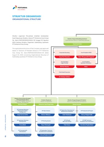 Struktur organisasi Perusahaan disahkan berdasarkanSurat Keputusan Direktur Utama PT Pertamina Hulu Energi No. Kpts-019/PHE00000/2024/-S0 tanggal 30 Agustus 2024 tentang Struktur Organisasi Subholding UpstreamPT Pertamina Hulu Energi.The organizational structure of the Company was approved based on Decision of President Director of PT Pertamina Hulu Energi No. Kpts-019/PHE00000/2024/-S0 dated August 30, 2024 concerning Organizational Structure of Subholding Upstream PT Pertamina Hulu Energi.STRUKTUR ORGANISASIORGANIZATIONAL STRUCTURE Vice President HSSEGelar Winayawidhi SugandaVice PresidentUpstream InnovationAkbarVice PresidentLegal CounselSiti Nur MaulinaCorporate SecretaryArya Dwi ParamitaChief Audit ExecutiveEri Sulistyo SutiknoChalid Said SalimDirektur Utama Subholding Upstream Chief Executive Officer of Subholding UpstreamVP Upstream Business Planning & Portfolio ManagementAsep Samsul ArifinVP Upstream Business DevelopmentToriq AbdatVP Commercial & MonetizationDwi Darmawanta HartadjajaRachmat HidajatDirektur Perencanaan Strategis & Pengembangan Bisnis Director of Strategic Planning & Business DevelopmentVP New VentureBintoro WibowoVP Existing AssetsBayu GiriansyahVP Exploration Technical Excellence & CoordinationAhmad Najihal AmalMuharram Jaya PangurisengDirektur Eksplorasi Director of ExplorationVP Subsurface Development & Resources EvaluationAndri HaribowoVP Drilling & Well InterventionFata YunusVP Production & ProjectBenny Hidajat SidikVP D&P Technical Excellence & CoordinationDevialina Puspita DewiAwang LazuardiDirektur Pengembangan & Produksi Director of Development & ProductionLaporan Tahunan %u2022 Annual Report 110HULU ENERGI