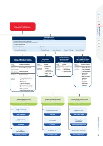 KetuaChairmanRinaldi FirmansyahAnggotaMembers%u2022 Tumpak Simanjuntak%u2022 Tutuka AriadjiKomite Nominasi dan RemunerasiNomination and Remuneration CommitteeKetuaChairmanNanang UntungAnggotaMembers%u2022 Tutuka Ariadji%u2022 Sigit Rahardjo%u2022 Paiman Raharjo%u2022 Agus Joko Pramono%u2022 Rizal Djunaedy Nasution%u2022 Dwi Adi Nugroho%u2022 Areiyando MakmunKomite Investasi dan Manajemen RisikoInvestment and Risk Management CommitteeKetuaChairmanRinaldi FirmansyahWakil Ketua 1Vice Chairman 1Tumpak SimanjuntakWakil Ketua 2Vice Chairman 2Nanang UntungSekretarisSecretaryMery LuciawatyAnggotaMembers%u2022 Virano Gazi Nasution%u2022 Oto Gurnita%u2022 Meidawati%u2022 Taufan Hunneman%u2022 Dharmawan H. Samsu%u2022 Gema Iriandus Pahalawan%u2022 Eko Ariantoro%u2022 Daniel Syahputra PurbaKomite Tata Kelola TerintegrasiIntegrated Governance CommitteeKetuaChairmanTumpak SimanjuntakAnggotaMembers%u2022 Rinaldi Firmansyah%u2022 Tjatur Purwadi%u2022 Kurnia Sari DewiKomite AuditAudit CommitteeDewan KomisarisBoard of CommissionersKomisaris Utama/Komisaris IndependenPresident Commissioner/Independent Commissioner%u2022 Rinaldi FirmansyahKomisaris IndependenIndependent CommissionerKomisarisCommissioners%u2022 Tumpak Simanjuntak %u2022 Tutuka Ariadji %u2022 Abdi Mustakim %u2022 Nanang Untung %u2022 Paiman RaharjoVP OperationalRisk ManagementDarmapalaVP Risk Strategy & GovernanceAsep ChaerudinVP ProjectRisk ManagementEdim Toto Sinulingga Mery LuciawatyDirektur Manajemen RisikoDirector of Risk ManagementSim VilliaVP ControllerCaesarian Sr. Manager TaxArif Syamsul HadiVP Financing & TreasuryDannif Utojo DanusaputroDirektur Keuangan & InvestasiDirector of Finance & InvestmentVP Human CapitalDewi Kurnia SalwaVP Supply ChainManagementBongbongan TampubolonVP Information TechnologyAkbar Yudha PuteraWhisnu BahriansyahDirektur SDM & Penunjang BisinisDirector of HC & Corporate ServicesRapat Umum Pemegang SahamGeneral Meeting of Shareholders010203 Company Profile Profil Perusahaan04050607 PT Pertamina Hulu Energi 111