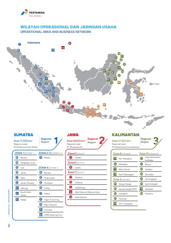 WILAYAH OPERASIONAL DAN JARINGAN USAHAOPERATIONAL AREA AND BUSINESS NETWORK ZONA 1 | ZONE 1 ZONA 2-3 | ZONE 2-3A Rantau 6 RokanB Pangkalan SusuC Lirik ZONA 4 | ZONE 4D Jambi E Ramba1 NSO F Prabumulih2 Jambi Merang G Pendopo3 Jabung H Limau4 South East JambiI Adera5 Kakap 7 Ogan Komering8 Raja Tempirai9 Corridor10 GMB Tanjung EnimRegionalRegionSUMATRAArea 71.590 km2Regional Lead:PT Pertamina Hulu RokanZona 5 | Zone 511 ONWJZona 6 | Zone 612 OSESZona 7 | Zone 7J TambunK SubangL Jatibarang13 Blok Natuna (Natuna Sea)14 East NatunaRegionalRegionJAWAArea 39.613 km2Regional Lead:PT Pertamina EPRegionalRegionKALIMANTANArea 57.225 km2Regional Lead:PT Pertamina Hulu IndonesiaZona 8 | Zone 8 Zona 10 | Zone 1015 Peri Mahakam 21 East Kalimantan & Attaka16 Mahakam P Bunyu17 West Ganal Q Tarakan18 East Sepinggan 22 NunukanZona 9 | Zone 9 23 Simenggaris19 Sanga Sanga 24 East AmbalatM Sanga Sanga (PEP) 25 AmbalatN Sangatta 26 MaratuaO Tanjung20 GMT SangattaIndonesiaFJKLST RDCBAG IE1394351382614 1712 112827293130323335363418 1520172519212616222423ONMQPULaporan Tahunan %u2022 Annual Report 114HULU ENERGI