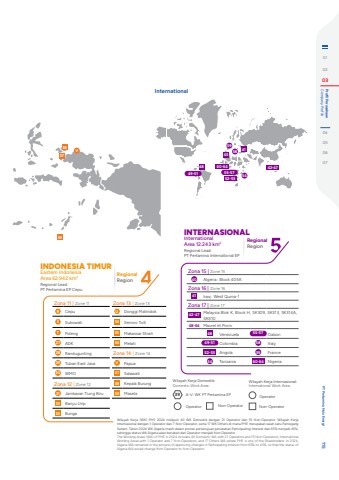 Zona 11 | Zone 11 Zona 13 | Zone 13R Cepu U Donggi MatindokS Sukowati 34 Senoro TolliT Poleng 35 Makassar Strait27 ADK 36 Melati28 Randugunting Zona 14 | Zone 1429 Tuban East Java V Papua30 WMO 37 SalawatiZona 12 | Zone 12 38 Kepala Burung31 Jambaran Tiung Biru 39 Masela32 Banyu Urip33 BungaRegionalRegionINDONESIA TIMUREastern IndonesiaArea 62.942 km2Regional Lead:PT Pertamina EP CepuZona 15 | Zone 1540 Algeria : Block 405AZona 16 | Zone 1641 Iraq : West Qurna-1Zona 17 | Zone 1742-47 Malaysia Blok K, Block H, SK309, SK313, SK314A, SK51048-64 Maurel et Prom48 Venezuela 55-57 Gabon49-51 Colombia 58 Italy52-53 Angola 59 France54 Tanzania 60-64 NigeriaRegionalRegionINTERNASIONALInternationalArea 12.243 km2Regional Lead:PT Pertamina International EPWilayah Kerja Internasional:International Work Area: OperatorNon-OperatorWilayah Kerja (WK) PHE 2024 meliputi 40 WK Domestik dengan 21 Operator dan 19 Non-Operator, Wilayah Kerja Internasional dengan 1 Operator dan 7 Non-Operator, serta 17 WK Others di mana PHE merupakan salah satu Pemegang Saham. Tahun 2024 WK Algeria masih dalam proses persetujuan perubahan Participating Interest dari 65% menjadi 45%, sehingga status WK Algeria akan berubah dari Operator menjadi Non Operator.The Working Areas (WA) of PHE in 2024 includes 40 Domestic WA with 21 Operators and 19 Non-Operators, International Working Areas with 1 Operator and 7 Non-Operators, and 17 Others WA where PHE is one of the Shareholders. In 2024, Algeria WA remained in the process of approving changes in Participating Interest from 65% to 45%, so that the status of Algeria WA would change from Operator to Non-Operator.Wilayah Kerja Domestik:Domestic Work Area: Operator39 A-V: WK PT Pertamina EPNon-OperatorInternational42-4752-5360-6449-51 55-573738V395958544541481010203 Company Profile Profil Perusahaan04050607 PT Pertamina Hulu Energi 115