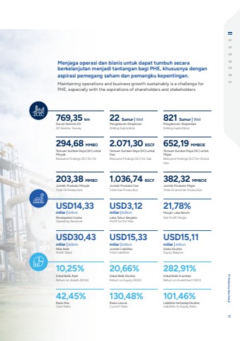 Menjaga operasi dan bisnis untuk dapat tumbuh secara berkelanjutan menjadi tantangan bagi PHE, khususnya dengan aspirasi pemegang saham dan pemangku kepentingan. Maintaining operations and business growth sustainably is a challenge for PHE, especially with the aspirations of shareholders and stakeholders.769,35 km 22 Sumur | Well 821 Sumur | WellSurvei Seismik 2D2D Seismic SurveyPengeboran-EksplorasiDrilling-ExplorationPengeboran-EksploitasiDrilling-Exploitation 294,68 MMBO 2.071,30 BSCF 652,19 MMBOETemuan Sumber Daya (2C) untuk MinyakResource Findings (2C) for OilTemuan Sumber Daya (2C) untuk GasResource Findings (2C) for GasTemuan Sumber Daya (2C) untuk MigasResource Findings (2C) for Oil and Gas203,38 MMBO 1.036,74 BSCF 382,32 MMBOEJumlah Produksi MinyakTotal Oil ProductionJumlah Produksi GasTotal Gas ProductionJumlah Produksi MigasTotal Oil and Gas ProductionUSD14,33 miliar | billionUSD3,12 miliar | billion21,78%Margin Laba BersihPendapatan UsahaOperating RevenueLaba Tahun BerjalanProfit for the YearNet Profit MarginUSD30,43 miliar | billionUSD15,33 miliar | billionUSD15,11miliar | billionNilai AsetAsset ValueJumlah LiabilitasTotal LiabilitiesSaldo EkuitasEquity Balance10,25% 20,66% 282,91%Imbal Balik AsetReturn on Assets (ROA)Imbal Balik EkuitasReturn on Equity (ROE)Imbal Balik InvestasiReturn on Investment (ROI)42,45% 130,48% 101,46%Rasio KasCash RatioRasio LancarCurrent RatioLiabilitas terhadap EkuitasLiabilities to Equity Ratio01020304050607Laporan Tahunan %u2022 Annual Report 10PT Pertamina Hulu Energi 11