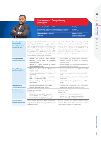 Dasar Penunjukan dan Periode JabatanBasis of Appointment and Term of OfficeDiangkat menjadi Direktur Eksplorasi berdasarkan Akta Keputusan RUPS No. 1 tanggal 3 Oktober 2022 yang diterbitkan Notaris Marianne Vincentia Hamdani, S.H., di Jakarta, terhitung sejak tanggal 27 September 2022 untuk masa jabatan hingga tanggal 27 September 2025. Jabatan ini merupakan periode pertama. Sebelumnya beliau tidak pernah menjabat dalam jajaran Direksi Perusahaan.Appointed as Director of Exploration by virtue of GMS Resolution Deed No. 1 dated October 3, 2022 issued by Notary Marianne Vincentia Hamdani, S.H., in Jakarta, as from September 27, 2022 for term of office up to September 27, 2025. This position is his first term. Prior to this, he had never held a position in the ranks of the Company%u2019s Directors.Riwayat PendidikanEducational Background%u2022 Magister (S2) Program Studi Geofisika, Reservoir, Jurusan Fisika di Universitas Indonesia (2008)%u2022 Sarjana (S1) Teknik Geofisika di Institut Teknologi Bandung (1996)%u2022 Master Degree (S2) Study Program Geophysics, Reservoir, Majoring in Physics at Universitas Indonesia (2008)%u2022 Bachelor Degree (S1) Geophysial Engineering at Institut Teknologi Bandung (1996)Riwayat PekerjaanEmployment History%u2022 VP Exploration Regional 2 - Jawa PT Pertamina EP (2021-2022)%u2022 VP East Area Exploration PT Pertamina EP (2018-2021)%u2022 G&G Senior Manager ExploitationPT Pertamina EP (2016-2018)%u2022 Service Delivery Manager-Schlumberger (1996-2008)%u2022 VP Exploration Regional 2 - Java PT Pertamina EP (2021-2022)%u2022 VP East Area Exploration PT Pertamina EP (2018-2021)%u2022 G&G Senior Manager Exploitation PT Pertamina EP (2016-2018)%u2022 Service Delivery Manager-Schlumberger (1996-2008) Sertifikasi ProfesiProfessional Certification%u2022 Certified Risk Professional (CRP), Badan Nasional Sertifikasi Profesi (2024)%u2022 Certified Risk Professional (CRP), Indonesian Professional Certification Authority (2024)Rangkap JabatanConcurrent PositionsDi dalam PHE: tidak adaDi luar PHE: %u2022 Direktur PT PHE Arun (2023-sekarang)%u2022 Direktur PT PHE Ambalat (2023-sekarang)%u2022 Direktur PT PHE Bukat (2023-sekarang)Within PHE: noneOutside PHE:%u2022 Director of PT PHE Arun (2023-present)%u2022 Director of PT PHE Ambalat (2023-present)%u2022 Director of PT PHE Bukat (2023-present)Hubungan AfiliasiAffiliated RelationshipsTidak memiliki hubungan afiliasi dengan/atau anggota Dewan Komisaris, anggota Direksi, atau pemegang saham.He does not have any affiliation relation with/or members of the Board of Commissioners, members of the Board of Directors, or shareholders.Muharram J. PangurisengDirektur EksplorasiDirector of ExplorationPeriode Menjabat / Terms of Office Usia / Age27 September 2022 s.d 27 September 2025, Period ke-1September 27, 2022 until September 27, 2025, 1st Term53 tahun53 years oldKewarganegaraan / Citizenship Domisili / DomicileIndonesia Semarang, Jawa TengahSemarang, Central Java010203 Company Profile Profil Perusahaan04050607 PT Pertamina Hulu Energi 129