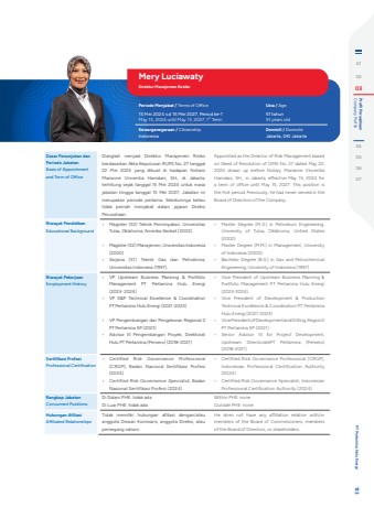 Dasar Penunjukan dan Periode JabatanBasis of Appointment and Term of OfficeDiangkat menjadi Direktur Manajemen Risiko berdasarkan Akta Keputusan RUPS No. 27 tanggal 22 Mei 2024 yang dibuat di hadapan Notaris Marianne Vincentia Hamdani, SH., di Jakarta, terhitung sejak tanggal 15 Mei 2024 untuk masa jabatan hingga tanggal 15 Mei 2027. Jabatan ini merupakan periode pertama. Sebelumnya beliau tidak pernah menjabat dalam jajaran Direksi Perusahaan.Appointed as the Director of Risk Management based on Deed of Resolution of GMS No. 27 dated May 22, 2024 drawn up before Notary Marianne Vincentia Hamdani, SH., in Jakarta, effective May 15, 2024 for a term of office until May 15, 2027. This position is the first period. Previously, he had never served in the Board of Directors of the Company.Riwayat PendidikanEducational Background%u2022 Magister (S2) Teknik Perminyakan, Universitas Tulsa, Oklahoma, Amerika Serikat (2002).%u2022 Magister (S2) Manajemen, Universitas Indonesia (2000)%u2022 Sarjana (S1) Teknik Gas dan Petrokimia, Universitas Indonesia (1997).%u2022 Master Degree (M.S.) in Petroleum Engineering, University of Tulsa, Oklahoma, United States (2002)%u2022 Master Degree (M.M.) in Management, University of Indonesia (2000)%u2022 Bachelor Degree (B.S.) in Gas and Petrochemical Engineering, University of Indonesia (1997)Riwayat PekerjaanEmployment History%u2022 VP Upstream Business Planning & Portfolio Management PT Pertamina Hulu Energi (2023- 2024)%u2022 VP D&P Technical Excellence & Coordination PT Pertamina Hulu Energi (2021-2023)%u2022 VP Pengembangan dan Pengeboran Regional 2 PT Pertamina EP (2021)%u2022 Advisor III Pengembangan Proyek, Direktorat Hulu PT Pertamina (Persero) (2018-2021)%u2022 Vice President of Upstream Business Planning & Portfolio Management PT Pertamina Hulu Energi (2023-2024)%u2022 Vice President of Development & Production Technical Excellence & Coordination PT Pertamina Hulu Energi (2021-2023) %u2022 Vice President of Development and Drilling, Region 2 PT Pertamina EP (2021)%u2022 Senior Advisor III for Project Development, Upstream DirectoratePT Pertamina (Persero) (2018-2021)Sertifikasi ProfesiProfessional Certification%u2022 Certified Risk Governance Professional (CRGP), Badan Nasional Sertifikasi Profesi (2024)%u2022 Certified Risk Governance Specialist, Badan Nasional Sertifikasi Profesi (2024)%u2022 Certified Risk Governance Professional (CRGP), Indonesian Professional Certification Authority (2024)%u2022 Certified Risk Governance Specialist, Indonesian Professional Certification Authority (2024)Rangkap JabatanConcurrent PositionsDi Dalam PHE: tidak adaDi Luar PHE: tidak adaWithin PHE: noneOutside PHE: noneHubungan AfiliasiAffiliated RelationshipsTidak memiliki hubungan afiliasi dengan/atau anggota Dewan Komisaris, anggota Direksi, atau pemegang saham.He does not have any affiliation relation with/or members of the Board of Commissioners, members of the Board of Directors, or shareholders.Mery LuciawatyDirektur Manajemen ResikoPeriode Menjabat / Terms of Office Usia / Age15 Mei 2024 s.d 15 Mei 2027, Period ke-1May 15, 2024 until May 15, 2027, 1st Term51 tahun51 years oldKewarganegaraan / Citizenship Domisili / DomicileIndonesia Jakarta, DKI Jakarta010203 Company Profile Profil Perusahaan04050607 PT Pertamina Hulu Energi 133