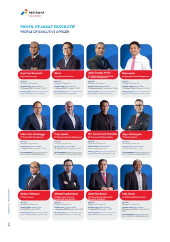 PROFIL PEJABAT EKSEKUTIFPROFILE OF EXECUTIVE OFFICERArya Dwi ParamitaCorporate SecretaryUsia | Age47 tahun | 47 years oldMenjabat Sejak | Terms of Office13 Oktober 2021 | October 13, 2021SK Pengangkatan | Decree of AppointmentSKMJ-00231/K20000/2021-S8Edim Toto SinulinggaVP Project Risk ManagementUsia | Age46 tahun | 46 years oldMenjabat Sejak | Terms of Office7 Oktober 2024 | October 7, 2024SK Pengangkatan | Decree of AppointmentSKMJ-00011/PHE50000/2024-S8Andri HaribowoVP Subsurface Development & Resources EvaluationUsia | Age53 tahun | 53 years oldMenjabat Sejak | Terms of Office1 Januari 2023 | January 1, 2023SK Pengangkatan | Decree of AppointmentSKMJ-00190/K20000/2022-S8AkbarVP Upstream InnovationUsia | Age51 tahun | 51 years oldMenjabat Sejak | Terms of Office3 Oktober 2023 | October 3, 2023SK Pengangkatan | Decree of AppointmentSKMJ-00122/K20000/2023-S8Bayu GiriansyahVP Existing AssetsUsia | Age51 tahun | 51 years oldMenjabat Sejak | Terms of Office5 Juni 2023 | June 5, 2023SK Pengangkatan | Decree of AppointmentSKMJ-00002/PHI00000/2023-S8Toriq AbdatVP Upstream Business DevelopmentUsia | Age53 tahun | 53 years oldMenjabat Sejak | Terms of Office30 Agustus 2023 | August 30, 2023SK Pengangkatan | Decree of AppointmentSKMJ-00007/PHE50000/2023-S8Asep Samsul ArifinVP Upstream Business Planning & Portfolio ManagementUsia | Age51 tahun | 51 years oldMenjabat Sejak | Terms of Office1 September 2024 | September 1, 2024SK Pengangkatan | Decree of AppointmentSKMJ-00162/K20000/2024-S8Dwi Darmawanta HartadjajaVP Commercial & MonetizationUsia | Age57 tahun | 57 years oldMenjabat Sejak | Terms of Office6 Mei 2024 | May 6, 2024SK Pengangkatan | Decree of AppointmentSKMJ-00006/PEP00000/2024-S8DarmapalaVP Operational Risk ManagementUsia | Age47 tahun | 47 years oldMenjabat Sejak | Terms of Office15 Oktober 2024 | October 15, 2024SK Pengangkatan | Decree of AppointmentSKMJ-00001/PPC00000/2024-S8Ahmad Najihal AmalVP Exploration Technical Excellence & CoordinationUsia | Age51 tahun | 51 years oldMenjabat Sejak | Terms of Office4 September 2023 | September 4, 2023SK Pengangkatan | Decree of AppointmentSKMJ-00011/PHE50000/2023-S8Bintoro WibowoVP New VentureUsia | Age48 tahun | 48 years oldMenjabat Sejak | Terms of Office5 Juni 2023 | June 5, 2023SK Pengangkatan | Decree of AppointmentSKMJ-00003/PHE50000/2023-S8Fata YunusVP Drilling & Well InterventionUsia | Age54 tahun | 54 years oldMenjabat Sejak | Terms of Office23 September 2024 | September 23, 2024SK Pengangkatan | Decree of AppointmentSKMJ-00016/PHI00000/2024-S8Laporan Tahunan %u2022 Annual Report 134HULU ENERGI