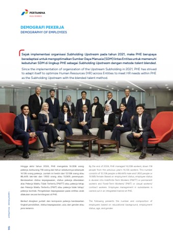 DEMOGRAFI PEKERJADEMOGRAPHY OF EMPLOYEES Sejak implementasi organisasi Subholding Upstream pada tahun 2021, maka PHE berupaya beradaptasi untuk mengoptimalkan Sumber Daya Manusia (SDM) lintas Entitas untuk memenuhi kebutuhan SDM di lingkup PHE sebagai Subholding Upstream dengan metode talent blended.Since the implementation of organization of the Upstream Subholding in 2021, PHE has strived to adapt itself to optimize Human Resources (HR) across Entities to meet HR needs within PHE as the Subholding Upstream with the blended talent method.Hingga akhir tahun 2024, PHE mengelola 14.008 orang pekerja, berkurang 118 orang dari tahun sebelumnya sebanyak 14.126 orang pekerja. Jumlah ini terdiri dari 12.108 orang atau 86,44% laki-laki dan 1.900 orang atau 13,56% perempuan. Berdasarkan status kepegawaian, status pekerja dibedakan atas Pekerja Waktu Tidak Tertentu (PWTT) atau pekerja tetap dan Pekerja Waktu Tertentu (PWT) atau pekerja tidak tetap/pekerja kontrak. Pengelolaan kepegawaian pada entitas anak dilakukan secara terintegrasi di PHE.Berikut disajikan jumlah dan komposisi pekerja berdasarkan tingkat pendidikan, status kepegawaian, usia, dan gender atau jenis kelamin.By the end of 2024, PHE managed 14,008 workers, down 118 people from the previous year's 14,126 workers. This number consists of 12,108 people or 86.44% male and 1,900 people or 13.56% female. Based on employment status, employee status is divided into Indefinite-Term Workers (PWTT) or permanent workers and Fixed-Term Workers/ (PWT) or casual workers/contract workers. Employee management in subsidiaries is carried out in an integrated manner at PHE.The following presents the number and composition of employees based on educational background, employment status, age, and gender.Laporan Tahunan %u2022 Annual Report 136HULU ENERGI