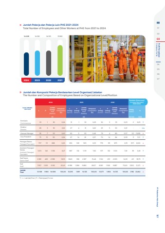 *) L = Laki-laki/Male | P = Perempuan/FemaleLevel JabatanJob Level2024 2023 2022Kenaikan (Penurunan) Increase (Decrease)2023-2024L PJumlah(orang)Total(Person)KomposisiComposition(%)L(orang)(Person)P(orang)(Person)Jumlah(orang)Total(Person)KomposisiComposition(%)L(orang)(Person)P(orang)(Person)Jumlah(orang)Total(Person)KomposisiComposition(%)OrangPerson %(1) (2) (3=1-2) (3/2)KomisarisCommissioner 33 1 30 0,24 31 1 32 0,23 30 3 33 0,23 2 6,25 %u2191DirekturDirector 28 3 30 0,22 27 4 31 0,22 25 5 30 0,21 - - n/aGeneral Manager 56 7 63 0,45 60 5 65 0,46 76 4 80 0,57 (2) (3,08) %u2193Vice President 75 15 90 0,64 67 14 81 0,57 70 14 84 0,59 9 11,11 %u2191Manager/SetaraManager/Equivalent 757 111 868 6,20 816 109 925 6,55 776 99 875 6,19 (57) (6,16) %u2193Assistant Manager/SetaraAssistant Manager/ Equivalent1.013 145 1.158 8,27 987 132 1.119 7,92 971 132 1.103 7,81 39 3,49 %u2191Staf SeniorSenior Staff 2.189 409 2.598 18,55 1.849 338 2.187 15,48 1.742 291 2.033 14,39 411 18,79 %u2191StafStaff 7.957 1.209 9.166 65,43 8.398 1.288 9.686 68,57 8.581 1.306 9.887 70,00 (520) (5,37) %u2193JumlahTotal 12.108 1.900 14.008 100,00 12.235 1.891 14.126 100,00 12.271 1.854 14.125 100,00 (118) (0,84) %u2193Jumlah dan Komposisi Pekerja Berdasarkan Level Organisasi/JabatanThe Number and Composition of Employees Based on Organizational Level/PositionJumlah Pekerja dan Pekerja Lain PHE 2021-2024Total Number of Employees and Other Workers at PHE from 2021 to 202414.008 14.126 14.125 15.9622024 2023 2022 2021010203 Company Profile Profil Perusahaan04050607 PT Pertamina Hulu Energi 137
