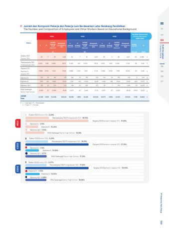 Status2024 2023 2022Kenaikan (Penurunan) Increase (Decrease)2023-2024L PJumlah(orang)Total(Person)KomposisiComposition(%)L(orang)(Person)P(orang)(Person)Jumlah(orang)Total(Person)KomposisiComposition(%)L(orang)(Person)P(orang)(Person)Jumlah(orang)Total(Person)KomposisiComposition(%)OrangPerson %(1) (2) (3=1-2) (3/2)Doktor (S3)Doctor (S3) 32 7 39 0,28 34 7 41 0,29 35 3 38 0,27 (2) (4,88) %u2193Pascasarjana (S2)Postgraduate (S2) 2.200 428 2.628 18,76 2.149 421 2.570 18,19 2.037 409 2.446 17,32 58 2,26 %u2191Sarjana (S1)Bachelor's degree (S1)5.989 1.252 7.241 51,69 5.988 1.233 7.221 51,12 5.992 1.206 7.198 50,96 20 0,28 %u2191Diploma IV 147 14 161 1,15 142 14 156 1,10 141 14 155 1,10 5 3,21 %u2191Diploma III 1.319 141 1.460 10,42 1.351 149 1.500 10,62 1.394 148 1.542 10,92 (40) (2,67) %u2193Diploma I & II 192 21 213 1,52 199 23 222 1,57 115 7 122 0,86 (9) (4,05) %u2193SMA SederajatSenior High School 2.229 37 2.266 16,18 2.373 43 2.416 17,10 2.557 67 2.624 18,58 (150) (6,21) %u2193JumlahTotal 12.108 1.900 14.008 100,00 12.236 1.890 14,126 100,00 12.271 1.854 14.125 100,00 (118) (0,84) %u21932022 2023 2024SMA Sederajat/Senior High School : 18,58%SMA Sederajat/Senior High School : 17,10%SMA Sederajat/Senior High School : 16,18%Sarjana (S1)/Bachelor's degree (S1) : 50,96%Sarjana (S1)/Bachelor's degree (S1) : 51,12%Sarjana (S1)/Bachelor's degree (S1) : 51,69%Pascasarjana (S2)/Postgraduate (S2) : 17,32%Pascasarjana (S2)/Postgraduate (S2) : 18,19%Pascasarjana (S2)/Postgraduate (S2) : 18,76%Doktor (S3)/Doctor (S3) : 0,27%Doktor (S3)/Doctor (S3) : 0,29%Doktor (S3)/Doctor (S3) : 0,28%Diploma III : 10,92%Diploma III : 10,62%Diploma III : 10,42%Diploma IV : 1,10%Diploma IV : 1,10%Diploma IV : 1,15%Diploma I & II : 0,86%Diploma I & II : 1,57%Diploma I & II : 1,52%*) L = Laki-laki | P = PerempuanL = Male | P = FemaleJumlah dan Komposisi Pekerja dan Pekerja Lain Berdasarkan Latar Belakang PendidikanThe Number and Composition of Employees and Other Workers Based on Educational Background 010203 Company Profile Profil Perusahaan04050607 PT Pertamina Hulu Energi 139