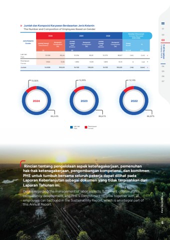 Jenis KelaminGender2024 2023 2023 2022Kenaikan (Penurunan) Increase (Decrease)2023-2024Jumlah (orang)Total (Person)KomposisiComposition(%)Jumlah(orang)Total(Person)KomposisiComposition(%)Jumlah(orang)Total(Person)KomposisiComposition(%)OrangPerson %(1) (2) (3=1-2) (3/2)Laki-lakiMale 12.108 86,44 12.234 86,61 12.270 86,87 (126) (1,03) %u2193PerempuanFemale 1.900 13,56 1.892 13,39 1.855 13,13 8 0,42 %u2191Jumlah 14.008 100,00 14.126 100,00 14.125 100,00 (118) (0,84) %u2193Laki-lakiMalePerempuanFemale13,13%86,87%2024 202213,56%86,44%13,39%86,61%2023 Rincian tentang pengelolaan aspek ketenagakerjaan, pemenuhan hak-hak ketenagakerjaan, pengembangan kompetensi, dan komitmen PHE untuk tumbuh bersama seluruh pekerja dapat dilihat pada Laporan Keberlanjutan sebagai dokumen yang tidak terpisahkan dari Laporan Tahunan ini.Details regarding the management of labor aspects, fulfillment of labor rights, competency development, and PHE's commitment to grow together with all employees can be found in the Sustainability Report, which is an integral part of this Annual Report.Jumlah dan Komposisi Karyawan Berdasarkan Jenis KelaminThe Number and Composition of Employees Based on Gender 010203 Company Profile Profil Perusahaan04050607 PT Pertamina Hulu Energi 141