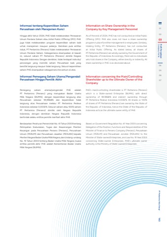 Informasi tentang Kepemilikan Saham Perusahaan oleh Manajemen KunciHingga akhir tahun 2024, PHE tidak melaksanakan Penawaran Umum Perdana Saham atau Initial Public Offering (IPO). PHE juga tidak melaksanakan program kepemilikan saham baik untuk manajemen maupun pekerja. Demikian pula entitas induk, PT Pertamina (Persero) tidak melaksanakan Penawaran Umum Perdana Saham. Sebagaimana disampaikan di bawah ini, seluruh saham PT Pertamina (Persero) dimiliki Negara Republik Indonesia. Dengan demikian, tidak terdapat individu/perorangan yang memiliki saham Perusahaan baik yang bersifat langsung maupun tidak langsung. Seluruh kepemilikan saham PHE disampaikan sebagaimana tercantum di atas.Informasi Pemegang Saham Utama/Pengendali Perusahaan Hingga Pemilik AkhirPemegang saham utama/pengendali PHE adalah PT Pertamina (Persero) yang merupakan Badan Usaha Milik Negara (BUMN), dengan kepemilikan langsung atas Perusahaan sebesar 99,9968% dan kepemilikan tidak langsung atas Perusahaan melalui PT Pertamina Pedeve Indonesia sebesar 0,0032%. Seluruh saham atau 100% saham PT Pertamina (Persero) dimiliki oleh Negara Republik Indonesia, dengan demikian Negara Republik Indonesia bertindak selaku entitas pemilik manfaat akhir PHE.Berdasarkan Peraturan Pemerintah No. 41 Tahun 2003 tentang Pelimpahan Kedudukan, Tugas dan Kewenangan Menteri Keuangan pada Perusahaan Persero (Persero), Perusahaan Umum (PERUM) dan Perusahaan Jawatan (PERJAN) kepada Menteri Negara Badan Usaha Milik Negara, dan Undang-undang No. 19 Tahun 2003 tentang Badan Usaha Milik Negara; kuasa entitas pemilik akhir PHE adalah Kementerian Badan Usaha Milik Negara (BUMN).Information on Share Ownership in the Company by Key Management PersonnelAs of the end of 2024, PHE has not conducted an Initial Public Offering (IPO). PHE also does not have a share ownership program in place for either management or employees. Similarly, Holding Entity, PT Pertamina (Persero), has not conducted an Initial Public Offering. As stated below, all shares of PT Pertamina (Persero) are wholly owned by the Government of the Republic of Indonesia. Accordingly, there are no individuals who hold shares in the Company, either directly or indirectly. All share ownership in PHE is as disclosed above.Information concerning the Main/Controlling Shareholder up to the Ultimate Owner of the CompanyPHE%u2019s main/controlling shareholder is PT Pertamina (Persero) which is a State-owned Enterprise (BUMN), with direct ownership of 99.9968% and indirect ownership through PT Pertamina Pedeve Indonesia 0.0032%. All shares or 100% of shares of PT Pertamina (Persero) are owned by the State of the Republic of Indonesia, hence the State of the Republic of Indonesia acts as the ultimate owner entity of PHE.Based on Government Regulation No. 41 Year 2003 concerning Delegation of the Position, Functions and Responsibilities of the Minister of Finance to Persero Company (Persero), Perusahaan Umum (PERUM) and Perusahaan Jonatan (PERJAN) to the Minister of State-owned Enterprises, and Law No. 19 Year 2003 concerning State-owned Enterprises; PHE%u2019s ultimate owner authority is the Ministry of State-owned Enterprises. 010203 Company Profile Profil Perusahaan04050607 PT Pertamina Hulu Energi 143