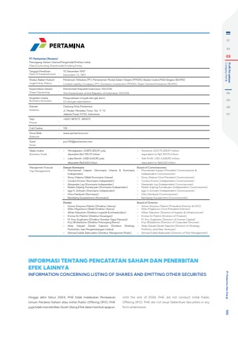 PT Pertamina (Persero) Pemegang Saham Utama/Pengendali/Entitas IndukMain/Controlling Shareholder/Holding EntityTanggal PendirianDate of Establishment : 10 Desember 1957December 10, 1957Status Badan HukumLegal Entity Status : Perseroan Terbatas (PT); Penanaman Modal Dalam Negeri (PMDN); Badan Usaha Milik Negara (BUMN)Limited Liability Company (PT); Domestic Investment (PMDN); State-Owned Enterprise (BUMN)Kepemilikan SahamShare Ownership : Pemerintah Republik Indonesia: 100,00%The Government of the Republic of Indonesia: 100.00%Kegiatan UsahaBusiness Activities : Pengusahaan minyak dan gas bumiOil and gas exploitationAlamatAddress: Gedung Grha PertaminaJl. Medan Merdeka Timur. No. 11-13Jakarta Pusat 10110, IndonesiaTelpPhone : +6221 3815111, 3816111Call Center : 135Situs WebWebsite: www.pertamina.comSurelEmail: pcc135@pertamina.comSkala UsahaBusiness Scale: %u2022 Pendapatan: US$75.326,97 juta, ekuivalen Rp1.193,70 triliun.%u2022 Laba Bersih: US$3.446,90 juta, ekuivalen Rp54,62 triliun%u2022 Revenue: USD 75,326.97 million, equivalent to Rp1,193.70 trillion.%u2022 Net Profit: USD 3,446.90 million, equivalent to Rp54.62 trillion.Manajemen PuncakTop Management: Dewan Komisaris%u2022 Mochamad Iriawan (Komisaris Utama & Komisaris Independen)%u2022 Dony Oskaria (Wakil Komisaris Utama)%u2022 Condro Kirono (Komisaris Independen)%u2022 Alexander Lay (Komisaris Independen)%u2022 Raden Adjeng Sondaryani (Komisaris Independen)%u2022 Iggi H. Achsien (Komisaris Independen)%u2022 Heru Pambudi (Komisaris)%u2022 Bambang Suswantono (Komisaris)Board of Commissioners%u2022 Mochamad Iriawan (President Commissioner & Independent Commissioner)%u2022 Dony Oskaria (Vice President Commissioner)%u2022 Condro Kirono (Independent Commissioner)%u2022 Alexander Lay (Independent Commissioner)%u2022 Raden Adjeng Sondaryani (Independent Commissioner)%u2022 Iggi H. Achsien (Independent Commissioner)%u2022 Heru Pambudi (Commissioner)%u2022 Bambang Suswantono (Commissioner)Direksi%u2022 Simon Aloysius Mantiri (Direktur Utama)%u2022 Wiko Migantoro (Wakil Direktur Utama)%u2022 Alfian Nasution (Direktur Logistik & Infrastruktur)%u2022 Emma Sri Martini (Direktur Keuangan)%u2022 M. Erry Sugiharto (Direktur Sumber Daya Manusia)%u2022 Erry Widiastono (Direktur Penunjang Bisnis)%u2022 Atep Salyadi Dariah Saputra (Direktur Strategi, Portofolio, dan Pengembangan Usaha)%u2022 Ahmad Siddik Badruddin (Direktur Manajemen Risiko)Board of Director%u2022 Simon Aloysius Mantiri (President Director & CEO)%u2022 Wiko Migantoro (Vice President Director)%u2022 Alfian Nasution (Director of logistic & Infrastructure)%u2022 Emma Sri Martini (Director of Finance)%u2022 M. Erry Sugiharto (Director of Human Capital)%u2022 Erry Widiastono (Director of Corporate Services)%u2022 Atep Salyadi Dariah Saputra (Director of Strategy, Portfolio, and New Ventures)%u2022 Ahmad Siddik Badruddin (Director of Risk Management)Hingga akhir tahun 2024, PHE tidak melakukan Penawaran Umum Perdana Saham atau Initial Public Offering (IPO). PHE juga tidak menerbitkan Surat Utang Efek dalam bentuk apapun.Until the end of 2024, PHE did not conduct Initial Public Offering (IPO). PHE did not issue Debenture Securities in any form whatsoever.INFORMASI TENTANG PENCATATAN SAHAM DAN PENERBITAN EFEK LAINNYAINFORMATION CONCERNING LISTING OF SHARES AND EMITTING OTHER SECURITIES 010203 Company Profile Profil Perusahaan04050607 PT Pertamina Hulu Energi 145