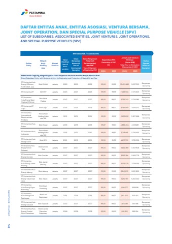 DAFTAR ENTITAS ANAK, ENTITAS ASOSIASI, VENTURA BERSAMA, JOINT OPERATION, DAN SPECIAL PURPOSE VEHICLE (SPV)LIST OF SUBSIDIARIES, ASSOCIATED ENTITIES, JOINT VENTURES, JOINT OPERATIONS, AND SPECIAL PURPOSE VEHICLES (SPV)Entitas Anak / SubsidiariesEntitasEntityWilayah KerjaWorking Area AlamatDomicileTahun PendirianYear of IncorporationTahun Beroperasi KomersialYear of Commercial Operation Tahun Penyetoran Modal oleh Pertamina dan/atau PHEYear of Payment of Capital by PHEKepemilikan PHEOwnership of PHE(%)Jumlah Aset Sebelum Eliminasi(ribuan AS$)Total Prior to Elimination (thousands of USD)Status OperasiStatus of Operation2024 2023 2024 2023Entitas Anak Langsung, dengan Kegiatan Usaha Eksplorasi untuk dan Produksi Minyak dan Gas Bumi Direct Subsidiary Entity, with Business Activity for Exploration and Production of Natural Oil and Gas PT Pertamina Hulu Energi Offshore North West JavaBlok ONWJ Jakarta 2009 2009 2009 99,00 99,00 10.053.482 9.297.555 BeroperasiOperatingPT Pertamina EP WK PEP Jakarta 2005 2001 2005 99,99 99,99 7.048.924 7.273.305 BeroperasiOperatingPT Pertamina Hulu Energi West Madura OffshoreBlok West Madura Jakarta 2007 2007 2007 99,00 99,00 5.793.743 5.719.289BeroperasiOperatingPT Pertamina EP Cepu Blok Cepu Jakarta 2005 2005 2005 99,00 99,00 5.133.049 5.516.411 BeroperasiOperatingPT Pertamina Internasional Eksplorasi dan ProduksiPerusahaan Holding/tidak ada WKJakarta 2013 2013 2013 99,99 99,99 5.453.092 5.327.068 BeroperasiOperatingPT Pertamina Hulu Rokan Blok Rokan Jakarta 2018 2018 2018 99,87 99,87 4.886.454 4.129.681 BeroperasiOperatingPT Pertamina Hulu IndonesiaPerusahaan Holding/tidak ada WKJakarta 2015 2015 2015 99,93 99,93 3.793.991 3.729.435BeroperasiOperatingPT Pertamina Hulu Energi OSES Blok SES Jakarta 2010 2010 2010 99,90 99,90 4.257.701 3.729.596 BeroperasiOperatingPT Pertamina Hulu Energi Tomori SulawesiBlok Senoro Toili Jakarta 2007 2007 2007 99,00 99,00 3.666.788 3.337.908BeroperasiOperatingPT Pertamina Hulu Energi Corridor Blok Corridor Jakarta 2007 2007 2007 99,00 99,00 3.365.184 2.905.779 BeroperasiOperatingPT Pertamina Hulu Energi Jambi MerangBlok Jambi Merang Jakarta 2007 2007 2007 99,00 99,00 3.025.579 2.759.019BeroperasiOperatingPT Pertamina Hulu Energi Jabung Blok Jabung Jakarta 2007 2007 2007 99,00 99,00 2.241.031 2.031.220 BeroperasiOperatingPT Pertamina Hulu Energi Tuban East JavaBlok Tuban Jakarta 2007 2007 2007 99,00 99,00 1.250.197 1.240.040BeroperasiOperatingPT Pertamina Hulu Energi Ogan KomeringBlok Ogan Komering Jakarta 2007 2007 2007 99,00 99,00 690.577 669.808BeroperasiOperatingPT Pertamina Hulu Energi East SepingganBlok East Sepinggan Jakarta 2014 2014 2014 99,00 99,00 851.424 630.411 BeroperasiOperatingPT Pertamina Hulu Energi Salawati Blok Salawati Jakarta 2007 2007 2007 99,00 99,00 461.089 451.188 BeroperasiOperatingPT Pertamina Hulu Energi Coastal Plains PekanbaruBlok Coastal Plains dan PekanbaruJakarta 2008 2008 2008 99,00 99,00 282.565 289.194 BeroperasiOperatingLaporan Tahunan %u2022 Annual Report 148HULU ENERGI