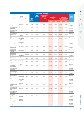 Entitas Anak / SubsidiariesEntitasEntityWilayah KerjaWorking Area AlamatDomicileTahun PendirianYear of IncorporationTahun Beroperasi KomersialYear of Commercial Operation Tahun Penyetoran Modal oleh Pertamina dan/atau PHEYear of Payment of Capital by PHEKepemilikan PHEOwnership of PHE(%)Jumlah Aset Sebelum Eliminasi(ribuan AS$)Total Prior to Elimination (thousands of USD)Status OperasiStatus of Operation2024 2023 2024 2023PT Pertamina Hulu Energi NSO Blok NSO Jakarta 2008 2008 2008 99,00 99,00 317.491 301.798 BeroperasiOperatingPT Pertamina Hulu Energi Kakap Blok Kakap Jakarta 2007 2007 2007 99,00 99,00 236.842 231.906 BeroperasiOperatingPT Pertamina Hulu Energi Siak Blok Siak Jakarta 2014 2014 2014 99,00 99,00 209.487 226.937 BeroperasiOperatingPT Pertamina Hulu Energi Salawati BasinBlok Kepala Burung Jakarta 2007 2007 2007 99,00 99,00 250.568 208.607BeroperasiOperatingPT Pertamina Hulu Energi Makassar StraitBlok Makassar Strait Jakarta 2007 2007 2007 99,00 99,00 160.125 157.675BeroperasiOperatingPT Pertamina Hulu Energi Raja TempiraiBlok Pendopo - Raja Jakarta 2007 2007 2007 99,00 99,00 150.615 151.591BeroperasiOperatingPT Pertamina Hulu Energi Kampar Blok Kampar Jakarta 2015 2015 2015 99,00 99,00 150.705 150.085 BeroperasiOperatingPertamina Hulu Energi Nunukan CompanyBlok Nunukan Cayman Island 2006 2006 2006 100,00 100,00 44.048 61.452 BeroperasiOperatingPertamina Hulu Energi Oil and Gas B.VBlok A (Natuna Sea) Amsterdam 2020 2020 2020 100,00 100,00 67.469 97.972 BeroperasiOperatingPT Pertamina Hulu Energi SimenggarisBlok Simenggaris Jakarta 2007 2007 2007 99,00 99,00 18.610 29.054 BeroperasiOperatingPT Pertamina EP Cepu ADKBlok Alas Dara Kemuning Jakarta 2014 2014 2014 99,00 99,00 26.578 25.943 BeroperasiOperatingPT Pertamina Hulu Energi RanduguntingBlok Randugunting Jakarta 2007 2007 2007 99,00 99,00 13.823 15.097 BeroperasiOperatingPT Pertamina Hulu Energi Abar Blok Abar Jakarta 2015 2015 2015 99,00 99,00 2.401 2.563 BeroperasiOperatingPT Pertamina Hulu Energi Lepas Pantai BunyuBlok Maratua Jakarta 2017 2017 2017 99,00 99,00 3.681 2.947 BeroperasiOperatingPT Pertamina Hulu Energi Anggursi Blok Anggursi Jakarta 2015 2015 2015 99,00 99,00 580 707 BeroperasiOperatingPT Pertamina Hulu Energi Ambalat TimurBlok Ambalat Timur Jakarta 2016 2016 2016 99,00 99,00 245 248 BeroperasiOperatingPT Pertamina Hulu Energi South East JambiBlok South East Jambi Jakarta 2017 2017 2017 99,00 99,00 30 212 BeroperasiOperatingPT Pertamina Hulu Energi North East JavaBlok Bunga Jakarta 2023 2023 2023 99,99 99,99 1.043 - BeroperasiOperatingPT Pertamina Hulu Energi Masela Blok Masela Jakarta 2023 2023 2023 99,99 99,99 357.654 345.834 BeroperasiOperatingPT Pertamina Hulu Energi Aceh DarussalamBlok Aceh Darussalam Jakarta 2024 2024 2024 99,99 - - - BeroperasiOperatingPT Pertamina Hulu Energi North KetapangBlok North Ketapang Jakarta 2024 2024 2024 99,99 - 4 - BeroperasiOperatingPT Pertamina Hulu Energi Sulawesi MelatiBlok Melati Jakarta 2024 2024 2024 99,99 - 6.374 - BeroperasiOperating010203 Company Profile Profil Perusahaan04050607 PT Pertamina Hulu Energi 149