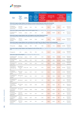 Entitas Anak / SubsidiariesEntitasEntityWilayah KerjaWorking Area AlamatDomicileTahun PendirianYear of IncorporationTahun Beroperasi KomersialYear of Commercial Operation Tahun Penyetoran Modal oleh Pertamina dan/atau PHEYear of Payment of Capital by PHEKepemilikan PHEOwnership of PHE(%)Jumlah Aset Sebelum Eliminasi(ribuan AS$)Total Prior to Elimination (thousands of USD)Status OperasiStatus of Operation2024 2023 2024 2023Entitas Anak Langsung, dengan Kegiatan Usaha Eksplorasi untuk dan Produksi Minyak dan Gas Bumi Non-Konvensional Direct Subsidiary Entity, with Business Activity for Exploration and Non-conventional Production of Natural Oil and Gas PT Pertamina Hulu Energi MNK Sumatra UtaraBlok MNK Sumbagut Jakarta 2012 2012 2012 99,50 99,50 8.204 8.271 BeroperasiOperatingEntitas Anak Langsung, dengan Kegiatan Usaha Portofolio Kegiatan Usaha | Direct Subsidiary Entity, with Business Activity Portfolio Business ActivitiesPT Pertamina Hulu Energi Arun Portfolio Jakarta 2015 2015 2015 99,997 99,997 323 324 BeroperasiOperatingEntitas Anak Langsung, dengan Kegiatan Usaha Jasa Pengeboran untuk Industri Minyak dan Gas Bumi Direct Subsidiary Entity, with Business Activity Drilling Service for the Natural Oil ad Gas Industry PT Pertamina Drilling Services IndonesiaServices Company Jakarta 2008 2008 2008 99,96 99,96 725.038 666.922 BeroperasiOperatingEntitas Anak Langsung, dengan Kegiatan Usaha Jasa Distribusi dan Logistik Energi, Hulu Migas Terintegrasi dan Penunjang Migas Direct Subsidiary Entity, with Business Activity Energy Distribution and Logistics, Integrated Upstream Oil and Gas and Oil and Gas Supporting ServicesPT Elnusa Tbk Services Company Jakarta 1969 1969 1969 51,10 51,10 659.605 621.898 BeroperasiOperatingEntitas Anak Langsung, dengan Kegiatan Usaha Pengolahan Gas Alam (LNG dan LPG) | Direct Subsidiary Entity, with Business Activity Natural Gas Processing (LNG and LPG)PT Badak NGL LNG Jakarta 1974 1974 1974 55,00 55,00 110.390 57.382 BeroperasiOperatingEntitas Anak Langsung Tanpa Kegiatan | Direct Subsidiary Entity Without Activity PT Pertamina Hulu Energi Tengah K Blok Tengah Jakarta 2007 2007 2007 99,00 99,00 517.685 512.036 BeroperasiOperatingPT Pertamina Hulu Energi NSB Blok B Jakarta 2013 2013 2013 99,50 99,50 345.304 345.184 BeroperasiOperatingPT Pertamina Hulu Energi Tuban Blok Tuban Jakarta 2003 2003 2003 99,90 99,90 229.505 227.317 BeroperasiOperatingPertamina Hulu Energi Offshore North West Java Llc.Blok Offshore Northwest JavaFlorida, USA 2010 2010 2010 100,00 100,00 220.067 220.067 BeroperasiOperatingPT Pertamina Hulu Energi South Jambi BBlok South Jambi B Jakarta 2007 2007 2007 99,00 99,00 23.753 23.753 BeroperasiOperatingPT Pertamina Hulu Energi Metan Tanjung IIBlok Tanjung II Jakarta 2010 2010 2010 99,90 99,90 2.483 2.594 BeroperasiOperatingPT Pertamina Hulu Energi Metana Suban IIBlok Suban II Jakarta 2011 2011 2011 99,90 99,90 1.057 1.059 BeroperasiOperatingPT Pertamina Hulu Energi Metana Sumatra Tanjung EnimBlok Tanjung Enim Jakarta 2009 2009 2009 99,00 99,00 799 800 BeroperasiOperatingPT Pertamina Hulu Energi Metana Kalimantan ABlok Sangatta I Jakarta 2008 2008 2008 99,00 99,00 612 613 BeroperasiOperatingPT Pertamina Hulu Energi MNK SakakemangBlok MNK Sakakemang Jakarta 2015 2015 2015 99,00 99,00 639 639 BeroperasiOperatingPT Pertamina Hulu Energi Metana Sumatra 7Blok Air Benakat III Jakarta 2012 2012 2012 99,50 99,50 587 591 BeroperasiOperatingPT Pertamina Hulu Energi Metana Sumatra 4Blok Muara Enim III Jakarta 2011 2011 2011 99,00 99,00 504 541 BeroperasiOperatingLaporan Tahunan %u2022 Annual Report 150HULU ENERGI