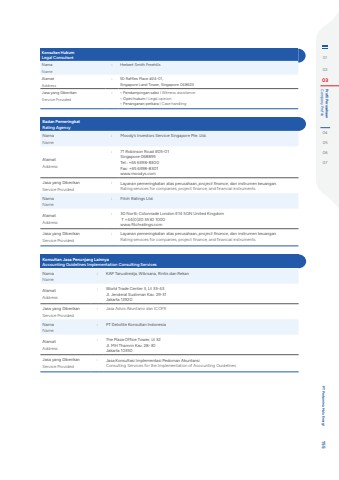Konsultan HukumLegal ConsultantNamaName: Herbert Smith FreehillsAlamatAddress: 50 Raffles Place #24-01,Singapore Land Tower, Singapore 048623Jasa yang DiberikanService Provided : %u2022 Pendampingan saksi I Witness assistance%u2022 Opini hukum I Legal opinion%u2022 Penanganan perkara I Case handlingBadan PemeringkatRating AgencyNamaName: Moody%u2019s Investors Service Singapore Pte. Ltd.AlamatAddress: 71 Robinson Road #05-01Singapore 068895Tel.: +65 6398-8300Fax: +65 6398-8301www.moodys.comJasa yang DiberikanService Provided : Layanan pemeringkatan atas perusahaan, project finance, dan instrumen keuangan.Rating services for companies, project finance, and financial instruments.NamaName: Fitch Ratings Ltd.AlamatAddress: 30 North Colonnade London E14 5GN United Kingdom T +44(0)20 3530 1000 www.fitchratings.comJasa yang DiberikanService Provided : Layanan pemeringkatan atas perusahaan, project finance, dan instrumen keuangan.Rating services for companies, project finance, and financial instruments.Konsultan Jasa Penunjang LainnyaAccounting Guidelines Implementation Consulting ServicesNamaName: KAP Tanudiredja, Wibisana, Rintis dan RekanAlamatAddress: World Trade Center 3, Lt 33-43Jl. Jenderal Sudirman Kav. 29-31Jakarta 12920Jasa yang DiberikanService Provided : Jasa Advis Akuntansi dan ICOFRNamaName: PT Deloitte Konsultan IndonesiaAlamatAddress: The Plaza Office Tower, Lt 32Jl. MH Thamrin Kav. 28-30Jakarta 10350Jasa yang DiberikanService Provided : Jasa Konsultasi Implementasi Pedoman AkuntansiConsulting Services for the Implementation of Accounting Guidelines010203 Company Profile Profil Perusahaan04050607 PT Pertamina Hulu Energi 155