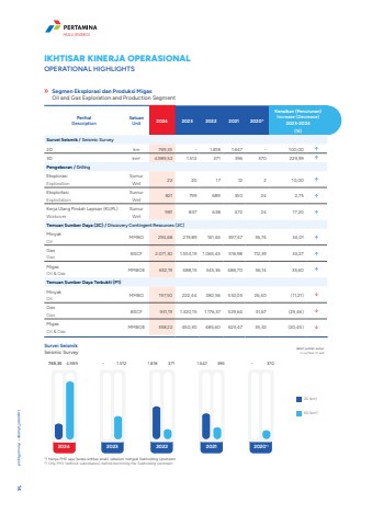 PerihalDescriptionSatuanUnit 2024 2023 2022 2021 2020*Kenaikan (Penurunan)Increase (Decrease)2023-2024(%)Survei Seismik / Seismic Survey2D km 769,35 - 1.818 1.647 - 100,00 %uf0e13D km2 4.989,52 1.512 371 396 370 229,99 %uf0e1Pengeboran / DrillingEksplorasiExplorationSumurWell 22 20 17 12 2 10,00 %uf0e1EksploitasiExploitationSumurWell821 799 689 350 24 2,75 %uf0e1Kerja Ulang Pindah Lapisan (KUPL)WorkoverSumurWell981 837 638 472 24 17,20 %uf0e1Temuan Sumber Daya (2C) / Discovery Contingent Resources (2C)MinyakOilMMBO 294,68 219,89 161,46 397,47 36,74 34,01 %uf0e1GasGasBSCF 2.071,30 1.554,19 1.065,45 516,98 112,39 33,27 %uf0e1MigasOil & GasMMBOE 652,19 488,15 345,36 486,70 56,14 33,60 %uf0e1Temuan Sumber Daya Terbukti (P1)MinyakOilMMBO 197,50 222,44 282,56 532,05 26,40 (11,21) %uf0e2GasGasBSCF 931,19 1.320,15 1.176,37 529,64 51,67 (29,46) %uf0e2MigasOil & GasMMBOE 358,22 450,30 485,60 623,47 35,32 (20,45) %uf0e2IKHTISAR KINERJA OPERASIONALOPERATIONAL HIGHLIGHTSSurvei SeismikSeismic Survey dalam jumlah sumur in number of well769,35 4.989 - 1.512 1.818 371 1.647 396 - 370 2024 2023 2022 2021 2020*)2D (km)3D (km2)Segmen Eksplorasi dan Produksi MigasOil and Gas Exploration and Production Segment*) Hanya PHE saja (tanpa entitas anak), sebelum menjadi Subholding Upstream*) Only PHE (without subsidiaries), before becoming the Subholding UpstreamLaporan Tahunan %u2022 Annual Report 14PT Pertamina Hulu Energi 15HULU ENERGI