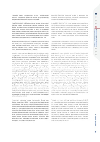 Indonesia dapat mempercepat proses pembangunan ekonomi, memperkuat ketahanan energi serta memastikan kesejahteraan bagi seluruh lapisan masyarakat. Pada RJPMN 2025-2029 sektor minyak dan gas berkontribusi signifikan dalam pembangunan nasional, terutama terkait dengan ketahanan energi dan perekonomian nasional. Upaya peningkatan produksi dan efisiensi di sektor ini diharapkan dapat memperkuat ketahanan energi nasional dan mendukung pertumbuhan ekonomi yang berkelanjutan. Dengan demikian sektor minyak dan gas bumi memainkan peran penting dalam mendukung tujuan pembangunan nasional yang lebih luas. Pemerintah Indonesia berupaya untuk terus mendorong kinerja hulu migas untuk dapat memenuhi target yang diharapkan. Meski demikian hingga akhir tahun 2024, Lifting minyak nasional mencapai 579,7 MBOPD, menurun dibandingkan tahun sebelumnya sebanyak 605,5 MBOPD.Kinerja di sektor hulu tentu tak lepas dari perdagangan energi yang terjadi di sektor hilir. Berdasarkan laporan Global Energy Prospects yang dipublikasikan oleh Bank Dunia, perdagangan energi mengalami dinamika yang dipengaruhi oleh faktorfaktor seperti penawaran, permintaan, serta infrastruktur penyimpanan dan transportasi bahan bakar. Krisis RusiaUkraina berdampak pada gangguan dalam perdagangan energi telah menciptakan pola perdagangan baru yang memengaruhi harga bahan bakar serta daya saing industri di berbagai kawasan. Selain itu, meningkatnya potensi eskalasi ancaman geopolitik di Timur Tengah juga menjadi faktor yang dapat mengganggu stabilitas harga minyak secara global. 4 (empat) faktor utama yang membentuk lanskap energi (geopolitik, ekonomi, regulasi, dan teknologi) juga berpengaruh pada sektor hilir industri minyak bumi global dengan menurunnya kapasitas kilang global. Penurunan ini disebabkan oleh berbagai faktor, termasuk melemahnya proyeksi permintaan masa depan, biaya operasional yang tinggi, kesulitan dalam menjual produk, serta meningkatnya kecenderungan untuk beralih ke energi terbarukan seperti penggunaan kendaraan listrik yang memerlukan nikel sebagai bahan baku untuk baterai.Pemerintah Indonesia melalui Kementerian Energi dan Sumber Daya Mineral (ESDM) terus mendorong industri untuk meningkatkan nilai tambah melalui hilirisasi mineral. Program hilirisasi sektor pertambangan yang sudah dilakukan pemerintah sejak 2021 silam membuahkan hasil dengan peningkatan nilai ekspor jika dibandingkan dengan ekspor bahan mentah. Hal ini kemudian berdampak pada meningkatnya kebutuhan energi untuk menyokong kebutuhan perkembangan hilirisasi industri. Seiring dengan hillirisasi industri tersebut, kebutuhan akan energi akan terus meningkat dan merambat ke sektor-sektor lain seperti pada sektor minyak dan gas. potential effectively, Indonesia is able to accelerate the economic development process, strengthen energy security and ensure welfare for all levels of society.In the 2025-2029 RJPMN, the oil and gas sector contributes significantly to national development, especially in relation to energy security and the national economy. Efforts to increase production and efficiency in this sector are expected to strengthen national energy security and support sustainable economic growth. The oil and gas sector therefore plays an important role in supporting broader national development goals.The Indonesian government is trying to continually encourage upstream oil and gas performance to meet expected targets. However, by the end of 2024 national oil production reached 579.7 MBOPD, down from that of the previous year of 605.5 MBOPD.Performance in the upstream sector is certainly inseparable from the energy trade occurring in the downstream sector. Based on the Global Energy Prospects report published by the World Bank, energy trade has undergone dynamics that are influenced by factors such as supply, demand as well as fuel storage and transportation infrastructure. The RussiaUkraine crisis has had an impact on disruptions in energy trade and has created new trade patterns that affect fuel prices and industrial competitiveness in various regions. In addition, the increasing potential for escalation of geopolitical threats in the Middle East has also become a factor that is capable of disrupting the stability of oil prices globally. The 4 (four) main factors that shape the energy landscape (geopolitics, economy, regulations, and technology) have also affected the downstream sector of the global petroleum industry, with a decline in global refinery capacity. This decline is caused by various factors, including weakening projections of future demands, high operational costs, difficulties in selling products as well as an increasing tendency to switch to renewable energy, such as the use of electric vehicles that require nickel as a raw material for batteries.Through the Ministry of Energy and Mineral Resources (ESDM), the Indonesian government continues to encourage industries to increase added value through mineral downstreaming. Downstreaming programs for the mining sector that has been carried out by the government since 2021 has yielded results, with an increase in export value when compared to raw material exports. This has then had an impact on the increasing need for energy to support industrial downstreaming development needs. Along with the downstreaming of the industry, the need for energy will continue to increase and spread to other sectors, such as the oil and gas sector. 010203 04 Management Discussion & Analysis Pembahasan & Analisis Manajemen050607 PT Pertamina Hulu Energi 161