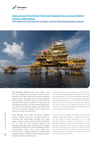 PHE Subholding Upstream efektif pada tanggal 1 April 2021 dan mendapat persetujuan legal end state pada bulan September 2021. Melalui implementasi organisasi Subholding Upstream, peran PHE sebagai Anak Perusahaan Pertamina berubah menjadi Subholding Upstream serta berdampak juga pada aktivitas yang ada pada AP PHE sebelumnya dan beberapa Anak Perusahaan Hulu lainnya. Sejalan dengan peran baru tersebut, PHE Subholding Upstream memiliki komitmen untuk terus melakukan eksplorasi, baik di existing assetmaupun area frontier atau new venture. Dalam beberapa tahun terakhir, Perusahaan melakukan kegiatan eksplorasi yang masif dan agresif. Selain itu, Perusahaan juga memanfaatkan teknologi terkini dalam kegiatan eksplorasi migas. Tidak hanya melakukan eksplorasi dari sisi migas saja, PHE Subholding Upstream juga mengeksplorasi potensi-potensi lainnya seperti di antaranya pemanfaatan teknologi terkini untuk meningkatkan efisiensi, mengembangkan sumber daya manusia (SDM), terus berinovasi untuk meningkatkan efisiensi dan efektivitas kerja, hingga menjalankan sinergi dan kolaborasi dengan AP maupun pemangku kepentingan strategis lainnya.Subholding Upstream became effective on April 1, 2021, and received end state legal approval in September 2021. Through the implementation of the Subholding Upstream organization, PHE%u2019s role as Pertamina%u2019s stand alone subsidiary changed to Subholding Upstream and also had an impact on PHE stand alone activities and several other Upstream Subsidiaries. In line with such new role, PHE Subholding Upstream has the commitment to continue exploring, both in existing assets as well as frontier or new venture areas.In recent years, the Company has carried out massive and aggressive exploration activities. In addition, the Company has also utilized the latest technology in oil and gas exploration activities. In addition to exploration of oil and gas, PHE Subholding Upstream has also been exploring other potentials such as the use of the latest technology to increase efficiency, developing human resources (HR), continuing to innovate to improve work efficiency and effectiveness, creating synergies and engaging in collaborations with AP and other strategic stakeholders.KEBIJAKAN STRATEGIS PHE DAN SINERGI DALAM KELOMPOK USAHA PERTAMINAPHE STRATEGIC POLICIES AND SYNERGY WITHIN PERTAMINA BUSINESS GROUPLaporan Tahunan %u2022 Annual Report 162HULU ENERGI