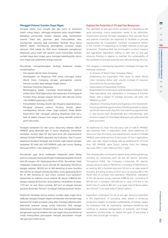Menggali Potensi Sumber Daya MigasProspek sektor hulu minyak dan gas bumi di Indonesia masih cukup bagus, sehingga eksplorasi perlu dioptimalkan. Kebijakan pemerintah melalui regulasi yang memberikan insentif fiskal dan perizinan akan memudahkan atau memberikan peluang bagi kontraktor Kontrak Kerja Sama (KKKS) dalam mendukung peningkatan produksi migas nasional. Oleh sebab itu, PHE terus melakukan pengeboran eksplorasi yang masif dan agresif untuk menambah temuan sumber daya baru migas guna menjaga keberlanjutan bisnis hulu migas dan ketahanan energi nasional.Perusahaan mengembangkan strategi eksplorasi melalui inisiatif berikut:%u2022 Pencapaian World Class CompanyMenetapkan visi Eksplorasi PHE untuk mencapai status World Class Company dengan peningkatan volume temuan sumber daya sebagai target utama.%u2022 Optimasi Portofolio Eksplorasi Bertanggung jawab mencapai keseimbangan optimal antara Near Field Exploration dan eksplorasi di Emerging & Frontier Area, dengan sasaran temuan rata-rata per sumur >50 MMBOE pada tahun 2027.%u2022 Pemanfaatan Existing Assets dan Ekspansi pada blok baru:Mengejar peluang potensi Existing Assets dalam mendapatkan temuan besar (high impact), Deep Water Exploration dan menggali peluang eksplorasi blok baru, baik di dalam maupun luar negeri yang memiliki potensi giant discovery.Terdapat tambahan 2C dari sumur discovery sebesar 406,31 MMBOE yang diperoleh dari 11 sumur eksplorasi, sementara tambahan sumber daya 2C dari hasil studi dan reassessmentsebesar 245,86 MMBOE diperoleh dari 9 struktur. Dari 11 sumur eksplorasi tersebut terdapat dua temuan high impact dengan tambahan 2C lebih dari 100 MMBOE yaitu dari sumur Padang Pancuran (PPC)-1, dan Tedong (TDG)-1.Perusahaan juga terus melakukan eksplorasi pada setiap potensi yang ada, termasuk dengan melakukan kegiatan seismik baik 2D maupun 3D. Sepanjang tahun 2024, Perusahaan telah melakukan melakukan survei seismik 2D sepanjang 769,35 km dengan sebaran 583,94 km di WK eksisting di area Sumatra dan 155 km di wilayah terbuka Sumatra, serta sepanjang 30,41 km di WK eksisting di Laut Utara Lombok (non-operator). Sementara itu realisasi survei seismik 3D seluas 4.989,52 km2dengan sebaran 873,44 km2 di Sumatera, 1.423,08 km2 di Jawa, 1.172 km2 di Laut Utara Lombok, 821 km2 di wilayah terbuka perairan Bone dan 700 km2 di wilayah terbuka perairan Seram. Eksplorasi terhadap semua potensi sumber daya migas terus dilakukan dengan harapan dapat memberikan nilai tambah bagi pemenuhan target produksi yang akan menjaga keberlanjutan keamanan pasokan energi untuk Indonesia. PHE sebagai Subholding Upstream Pertamina akan terus mengembangkan pengelolaan operasi di dalam dan luar negeri secara profesional untuk mewujudkan pencapaian menjadi perusahaan minyak dan gas bumi kelas dunia.Explore the Potential of Oil and Gas ResourcesThe upstream oil and gas sector prospect in Indonesia is still quite promising, hence exploration needs to be optimized. Government policies through regulations that provide fiscal and permits incentives are expected to facilitate or provide opportunities for Cooperation Contract Contractors (KKKS) in the context of supporting to increase national oil and gas production. Therefore, PHE has continued to conduct massive and aggressive exploration drilling to add new oil and gas resource findings in regards to maintain the sustainability of the upstream oil and gas business and national energy security.The company is developing exploration strategies through the following initiatives:%u2022 To Achieve of World Class Company StatusEstablishing the Exploration PHE vision to attain World Class Company status with volume increase of resource discoveries as the primary target.%u2022 Optimization of Exploration PortfolioResponsible for achieving an optimal balance between Near Field Exploration and exploration in Emerging & Frontier Areas, with a target of average discovery per well >50 MMBOE by 2027.%u2022 Utilization of Existing Assets and Expansion into new blocks:Pursuing potential opportunities of Existing Assets to obtain significant discoveries (big fish) and exploring opportunities in new blocks, both domestically and internationally, with minimum target of 2 the Rokan Block per year with potential giant discovery.An additional 2C from the discovery well of 406.31 MMBOE was obtained from 11 exploration wells, while additional 2C resources from the study and reassessment results of 245.86 MMBOE were obtained from 9 structures. Of the 11 exploration wells, two high impact findings with an additional 2C of more than 100 MMBOE were found, namely from the Padang Pancuran (PPC)-1 and Tedong (TDG)-1 wells.The company also continues to explore every existing potential, including by conducting both 2D and 3D seismic activities. Throughout 2024, the Company conducted 2D seismic surveys along an area of 769.35 km, consisting of 583.94 km in an existing WK in Sumatra area and 155 km in an open area of Sumatra, and along an area of 30.41 km in an existing WK in the North Sea of Lombok (non-operator). Meanwhile, realization of the 3D seismic survey reached 4,989.52 km2, consisting of 873.44 km2 in Sumatra, 1,423.08 km2 in Java, 1,172 km2 in the North Sea of Lombok, 821 km2 in an open area of Bone waters and 700 km2 in an open area of Seram waters. Exploration continuous for all oil and gas resource potentials in the expectation of providing value added in achieving production targets to maintain sustainability of energy supply for Indonesia. PHE as Subholding Upstream Pertamina will continue to develop management of domestic and foreign operations professionally to realize the goal of becoming a world-class oil and gas company.010203 04 Management Discussion & Analysis Pembahasan & Analisis Manajemen050607 PT Pertamina Hulu Energi 163