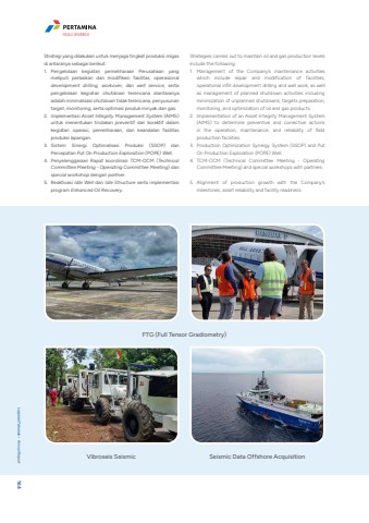 Strategi yang dilakukan untuk menjaga tingkat produksi migas di antaranya sebagai berikut: 1. Pengelolaan kegiatan pemeliharaan Perusahaan yang meliputi perbaikan dan modifikasi fasilitas, operasional development drilling, workover, dan well service, serta pengelolaan kegiatan shutdown terencana diantaranya adalah minimalisasi shutdown tidak terencana, penyusunan target, monitoring, serta optimasi produk minyak dan gas.2. Implementasi Asset Integrity Management System (AIMS) untuk menentukan tindakan preventif dan korektif dalam kegiatan operasi, pemeliharaan, dan keandalan fasilitas produksi lapangan.3. Sistem Sinergi Optimalisasi Produksi (SSOP) dan Percepatan Put On Production Exploration (POPE) Well.4. Penyelenggaraan Rapat koordinasi TCM-OCM (Technical Committee Meeting - Operating Committee Meeting) dan special workshop dengan partner.5. Reaktivasi Idle Well dan Idle Structure serta implementasi program Enhanced Oil Recovery.Strategies carried out to maintain oil and gas production levels include the following:1. Management of the Company%u2019s maintenance activities which include repair and modification of facilities, operational infill development drilling and well work, as well as management of planned shutdown activities including minimization of unplanned shutdowns, targets preparation, monitoring, and optimization of oil and gas products.2. Implementation of an Asset Integrity Management System (AIMS) to determine preventive and corrective actions in the operation, maintenance, and reliability of field production facilities.3. Production Optimization Synergy System (SSOP) and Put On Production Exploration (POPE) Well.4. TCM-OCM (Technical Committee Meeting - Operating Committee Meeting) and special workshops with partners.5. Alignment of production growth with the Company%u2019s milestones, asset reliability and facility readiness.FTG (Full Tensor Gradiometry)Vibroseis Seismic Seismic Data Offshore AcquisitionLaporan Tahunan %u2022 Annual Report 164HULU ENERGI