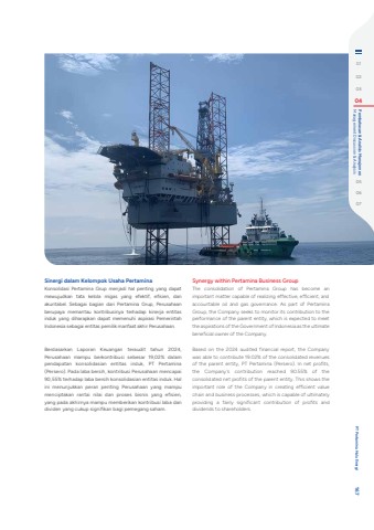 Sinergi dalam Kelompok Usaha PertaminaKonsolidasi Pertamina Grup menjadi hal penting yang dapat mewujudkan tata kelola migas yang efektif, efisien, dan akuntabel. Sebagai bagian dari Pertamina Grup, Perusahaan berupaya memantau kontribusinya terhadap kinerja entitas induk yang diharapkan dapat memenuhi aspirasi Pemerintah Indonesia sebagai entitas pemilik manfaat akhir Perusahaan.Berdasarkan Laporan Keuangan teraudit tahun 2024, Perusahaan mampu berkontribusi sebesar 19,02% dalam pendapatan konsolidasian entitas induk, PT Pertamina (Persero). Pada laba bersih, kontribusi Perusahaan mencapai 90,55% terhadap laba bersih konsolidasian entitas induk. Hal ini menunjukkan peran penting Perusahaan yang mampu menciptakan rantai nilai dan proses bisnis yang efisien, yang pada akhirnya mampu memberikan kontribusi laba dan dividen yang cukup signifikan bagi pemegang saham.Synergy within Pertamina Business GroupThe consolidation of Pertamina Group has become an important matter capable of realizing effective, efficient, and accountable oil and gas governance. As part of Pertamina Group, the Company seeks to monitor its contribution to the performance of the parent entity, which is expected to meet the aspirations of the Government of Indonesia as the ultimate beneficial owner of the Company.Based on the 2024 audited financial report, the Company was able to contribute 19.02% of the consolidated revenues of the parent entity, PT Pertamina (Persero). In net profits, the Company's contribution reached 90.55% of the consolidated net profits of the parent entity. This shows the important role of the Company in creating efficient value chain and business processes, which is capable of ultimately providing a fairly significant contribution of profits and dividends to shareholders.010203 04 Management Discussion & Analysis Pembahasan & Analisis Manajemen050607 PT Pertamina Hulu Energi 167