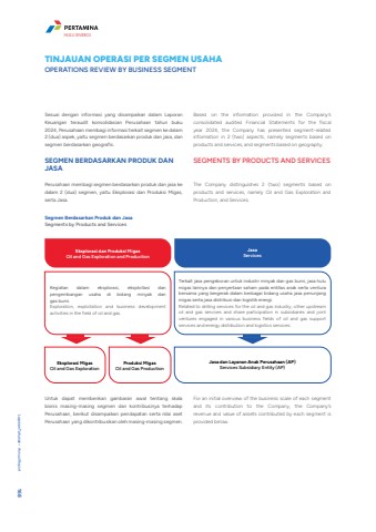 Sesuai dengan informasi yang disampaikan dalam Laporan Keuangan teraudit konsolidasian Perusahaan tahun buku 2024, Perusahaan membagi informasi terkait segmen ke dalam 2 (dua) aspek, yaitu segmen berdasarkan produk dan jasa, dan segmen berdasarkan geografis.SEGMEN BERDASARKAN PRODUK DAN JASAPerusahaan membagi segmen berdasarkan produk dan jasa ke dalam 2 (dua) segmen, yaitu Eksplorasi dan Produksi Migas, serta Jasa.Based on the information provided in the Company%u2019s consolidated audited Financial Statements for the fiscal year 2024, the Company has presented segment-related information in 2 (two) aspects, namely segments based on products and services, and segments based on geography.SEGMENTS BY PRODUCTS AND SERVICESThe Company distinguishes 2 (two) segments based on products and services, namely Oil and Gas Exploration and Production, and Services.TINJAUAN OPERASI PER SEGMEN USAHAOPERATIONS REVIEW BY BUSINESS SEGMENTUntuk dapat memberikan gambaran awal tentang skala bisnis masing-masing segmen dan kontribusinya terhadap Perusahaan, berikut disampaikan pendapatan serta nilai aset Perusahaan yang dikontribusikan oleh masing-masing segmen.For an initial overview of the business scale of each segment and its contribution to the Company, the Company%u2019s revenue and value of assets contributed by each segment is provided below.Eksplorasi MigasOil and Gas ExplorationProduksi MigasOil and Gas ProductionJasa dan Layanan Anak Perusahaan (AP)Services Subsidiary Entity (AP)Eksplorasi dan Produksi MigasOil and Gas Exploration and ProductionJasaServicesTerkait jasa pengeboran untuk industri minyak dan gas bumi, jasa hulu migas lainnya dan penyertaan saham pada entitas anak serta ventura bersama yang bergerak dalam berbagai bidang usaha jasa penunjang migas serta jasa distribusi dan logistik energi.Related to drilling services for the oil and gas industry, other upstream oil and gas services and share participation in subsidiaries and joint ventures engaged in various business fields of oil and gas support services and energy distribution and logistics services.Kegiatan dalam eksplorasi, eksploitasi dan pengembangan usaha di bidang minyak dan gas bumi.Exploration, exploitation and business development activities in the field of oil and gas.Segmen Berdasarkan Produk dan JasaSegments by Products and ServicesLaporan Tahunan %u2022 Annual Report 168HULU ENERGI