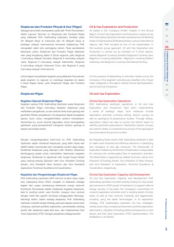 Eksplorasi dan Produksi Minyak & Gas (Migas)Sebagaimana telah disampaikan pada bab %u201cProfil Perusahaan%u201d dalam Laporan Tahunan ini, Eksplorasi dan Produksi Migas yang dilakukan PHE Subholding Upstream tersebar pada 40 Wilayah Kerja di Indonesia dan 25 Wilayah Kerja di berbagai wilayah internasional termasuk didalamnya PHE merupakah salah satu pemegang saham. Pada pendekatan kelompok usaha, Eksplorasi dan Produksi Migas dilakukan oleh yang tergabung dalam 5 (lima) regional, yaitu Regional 1 mencakup wilayah Sumatra, Regional 2 mencakup wilayah Jawa, Regional 3 mencakup wilayah Kalimantan, Regional 4 mencakup wilayah Indonesia Timur, dan Regional 5 yang mencakup wilayah internasional.Untuk dapat menjelaskan kegiatan yang dilakukan Perusahaan pada segmen ini, laporan ini membagi kegiatan ke dalam 2 (dua) bagian besar, yaitu Eksplorasi Migas, dan Produksi Migas.Eksplorasi MigasKegiatan Operasi Eksplorasi MigasKegiatan operasi PHE Subholding Upstream pada Eksplorasi dan Produksi Migas mencakup kegiatan eksplorasi yang melibatkan pengeboran, survei seismik serta studi geologi dan geofisika. Melalui pengeboran, tim eksplorasi dapat mengakses lapisan bumi untuk mengidentifikasi potensi hidrokarbon. Sementara itu, survei seismik digunakan untuk mendapatkan gambaran yang komprehensif mengenai struktur geologi di bawah permukaan tanah.Dengan mengintegrasikan hasil-hasil ini, PHE Subholding Upstream dapat membuat keputusan yang lebih tepat dan efektif dalam menemukan dan mengelola sumber daya migas. Direktorat Eksplorasi yang dipimpin oleh Direktur Eksplorasi bertanggung jawab untuk memastikan kelancaran kegiatan eksplorasi. Direktorat ini diperkuat oleh fungsi-fungsi terkait yang masing-masing dipimpin oleh Vice President Existing Assets, Vice President New Venture, dan Vice President Exploration Technical Excellence & Coordination.Kapasitas dan Pengembangan Eksplorasi MigasPHE Subholding Upstream aktif mencari sumber daya migas baru sepanjang tahun 2024. Langkah ini dilakukan sebagai bagian dari upaya mendukung ketahanan energi nasional. Komitmen Perusahaan adalah melakukan kegiatan eksplorasi, baik di existing asset, area frontier, maupun new venturedengan masif dan agresif, termasuk menggunakan teknologiteknologi terkini. Dalam strategi eksplorasi, PHE Subholding Upstream memiliki empat strategi, yaitu pencapaian world class company, optimasi portfolio exploration, pemanfaatan existing assets dan eksplorasi pada blok baru, dan implementasi Fast Track Exploration (FTE). Dengan penjabaran sebagai berikut:Oil & Gas Exploration and ProductionAs stated in the %u201cCompany Profile%u201d chapter in this Annual Report, Oil and Gas Exploration and Production carried out by PHE Subholding Upstream has been spread across 40 Working Areas in Indonesia and 25 Working Areas in various international regions, with PHE included as one of the shareholders. In the business group approach, Oil and Gas Exploration and Production is carried out by members of 5 (five) regions, namely Regional 1 covering Sumatra, Regional 2 covering Java, Regional 3 covering Kalimantan, Regional 4 covering Eastern Indonesia, and Regional 5 covering international territory.For the purpose of elaborating on activities carried out by the Company in this segment, activities are classified into 2 (two) major categories in this report, namely Oil and Gas Exploration, and Oil and Gas Production.Oil and Gas ExplorationOil and Gas Exploration OperationsPHE Subholding Upstream operations in Oil and Gas Exploration and Production have been implementing a series of strategic steps, Such measures include exploration activities involving drilling, seismic surveys as well as geological & geophysical studies. Through drilling, exploration teams are able to access the Earth%u2019s layers to identify potential hydrocarbons. Meanwhile, seismic surveys are used to obtain a comprehensive picture of the geological structure below the ground surface. By integrating these results, PHE Subholding Upstream is able to make more informed and effective decisions in identifying and managing oil and gas resources. The Directorate of Exploration headed by the Director of Exploration is responsible for ensuring the uninterrupted flow of exploration activities. The Directorate is supported by related functions, led by Vice President of Existing Assets, Vice President of New Venture, and Vice President of Exploration Technical Excellence & Coordination, respectively.Oil and Gas Exploration Capacity and DevelopmentOil and Gas Exploration Capacity and Development PHE Subholding Upstream has been actively looking for new oil and gas resources in 2023 as part of endeavors to support national energy security. It has been the Company%u2019s commitment to conduct exploration activities, both in existing assets, frontier areas, as well as new ventures massively and aggressively, including using the latest technologies. In its exploration strategy, PHE Subsholding Upstream has four strategies, namely world class company achievement, portfolio exploration optimization, utilization of existing assets and expansion in new blocks, and Fast Track Exploration (FTE) implementation. The breakdown is as follows:010203 04 Management Discussion & Analysis Pembahasan & Analisis Manajemen050607 PT Pertamina Hulu Energi 171